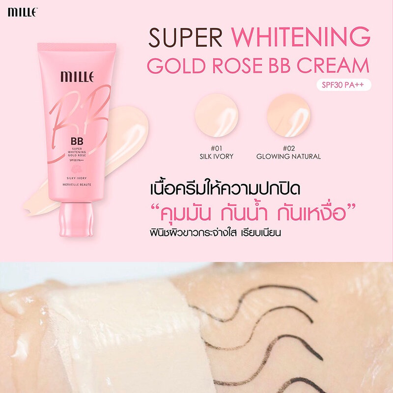 Mille Super White Gold Rose BB Cream SPF30/PA++ 6g #02 บีบีครีมสีชมพูสูตรใหม่ เพิ่มส่วนผสมของทองคำบริสุทธิ์ ที่มีคุณสมบัติช่วยชะลอการเกิดริ้วรอยซึ่งเป็นสัญญาณแรกของปัญหาผิวที่สาวๆ ทุกคนกังวล เนื้อบีบีครีมเทคโนโลยีล่าสุดจากเกาหลี ที่ได้รับการรับรองคุณภาพในทุกขั้นตอน ให้สัมผัสเบาสบายผิว ซึมซาบเร็ว ไม่เป็นขุยและให้ความขาวกระจ่างใส พร้อมด้วยสารป้องกันแสงแดด มอบสัมผัสเนียนเรียบ กระจ่างใส ดุจคริสตัลเม็ดงามให้คุณได้เจิดจรัสเนินนานตลอดวัน• #2 Natural สำหรับผิวสุขภาพดี ให้ความเปล่งปลั่ง กระจ่างใสอย่างเป็นธรรมชาติ