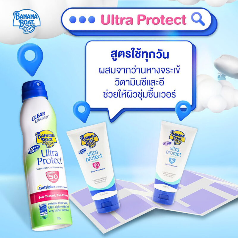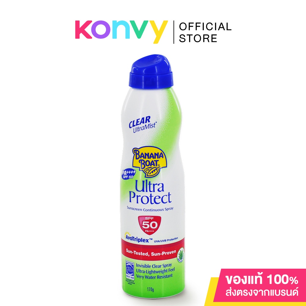 Cr.facebook.com/BananaBoatThailandBanana Boat Clear Ultra Mist Ultra Protect Sunscreen Continuous Spray Spf 50 Pa+++170mlเหมาะสำหรับผู้ที่ต้องสัมผัสแสงแดดเป็นประจำ สามารถป้องกันผิวหนัง กันทั้งรังสี UVA & UVBเนื้อครีมไม่เหนียวเหนอะหนะ ซึมซาบเข้าสู่ผิวได้ดี สามารถใช้ได้ทุกวัน กันแดดได้ยาวนาน กันน้ำได้ดี มีส่วนผสมของ Alovera , Vitamins C และ Vitamins Eช่วยให้ผิวเนียนนุ่ม ชุ่มชื้น ไม่มีส่วนผสมของน้ำหอม จึงไม่ระคายเคืองแม้ผิวที่แพ้ง่าย ช่วยปกป้องผิวจากการเผาไหม้ของแสงแดดถึง 50 เท่า