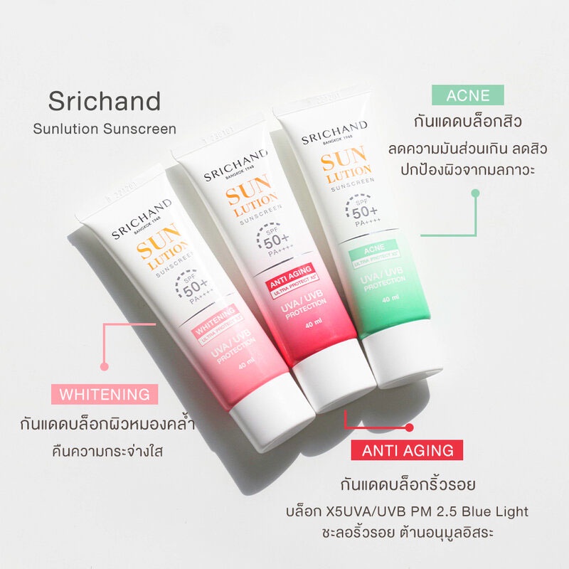 Cr: Facebook.com/srichand1948Srichand Sunlution Acne Care Sunscreen SPF50+ PA++++ 40mlกันแดดสูตรแอคเน่แคร์กู้ผิวใสไกลสิว ช่วยปกป้องผิวจากรังสี UVA และ UVB ในแสงแดด ป้องกันการเกิด photo aging อันเนื่องมาจากแสงสีฟ้า และยังช่วยปกป้องผิวจากมลภาวะภายนอก เนื้อบางเบาเกลี่ยง่าย ลดความมันส่วนเกิน ล้างออกง่าย จัดการสาเหตุของการเกิดสิวอย่างอ่อนโยน
