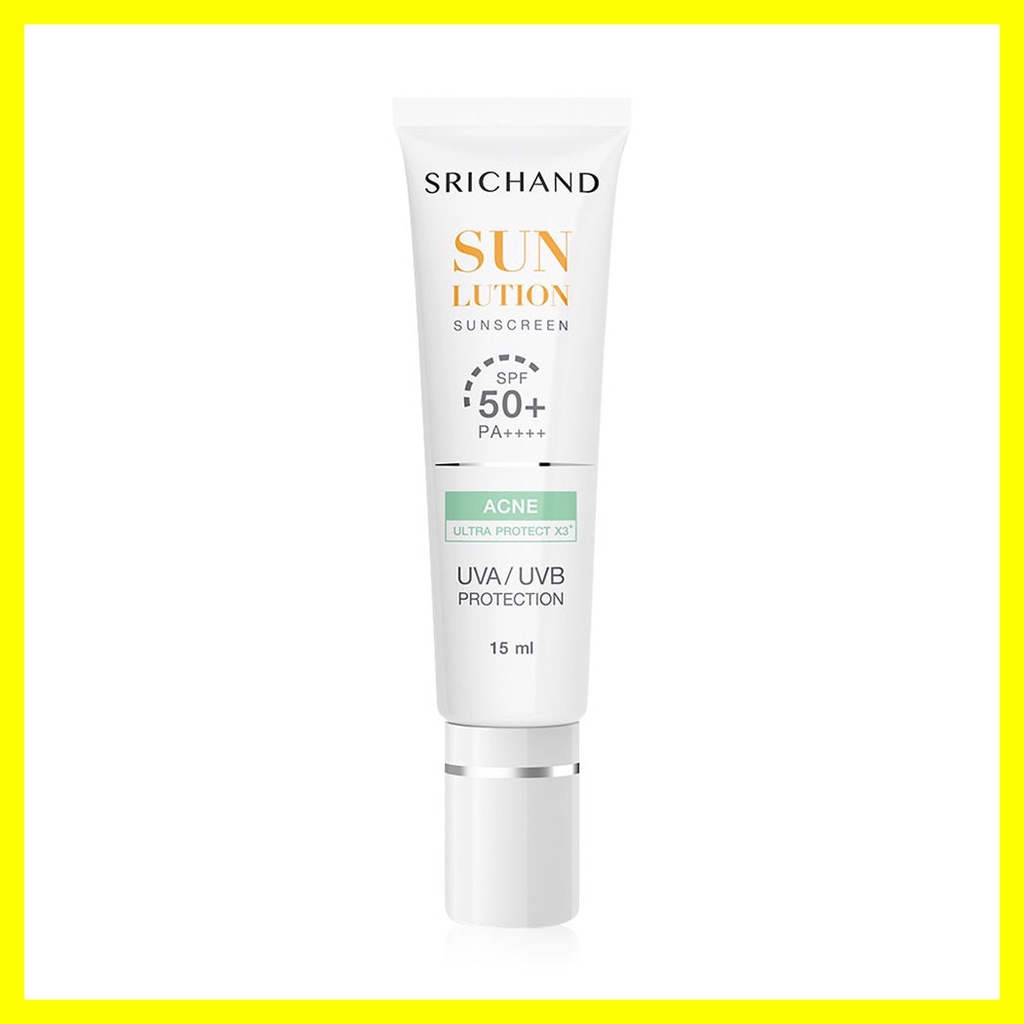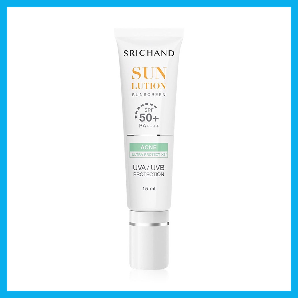 Cr: Facebook.com/srichand1948Srichand Sunlution Acne Care Sunscreen SPF50+/PA++++ 15ml กันแดดสูตรแอคเน่แคร์กู้ผิวใสไกลสิว ช่วยปกป้องผิวจากรังสี UVA และ UVB ในแสงแดด ป้องกันการเกิด photo aging อันเนื่องมาจากแสงสีฟ้า และยังช่วยปกป้องผิวจากมลภาวะภายนอก เนื้อบางเบาเกลี่ยง่าย ลดความมันส่วนเกิน ล้างออกง่าย จัดการสาเหตุของการเกิดสิวอย่างอ่อนโยน