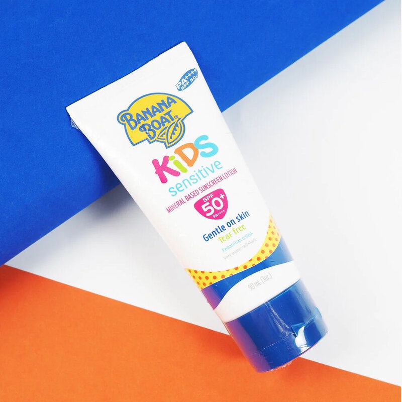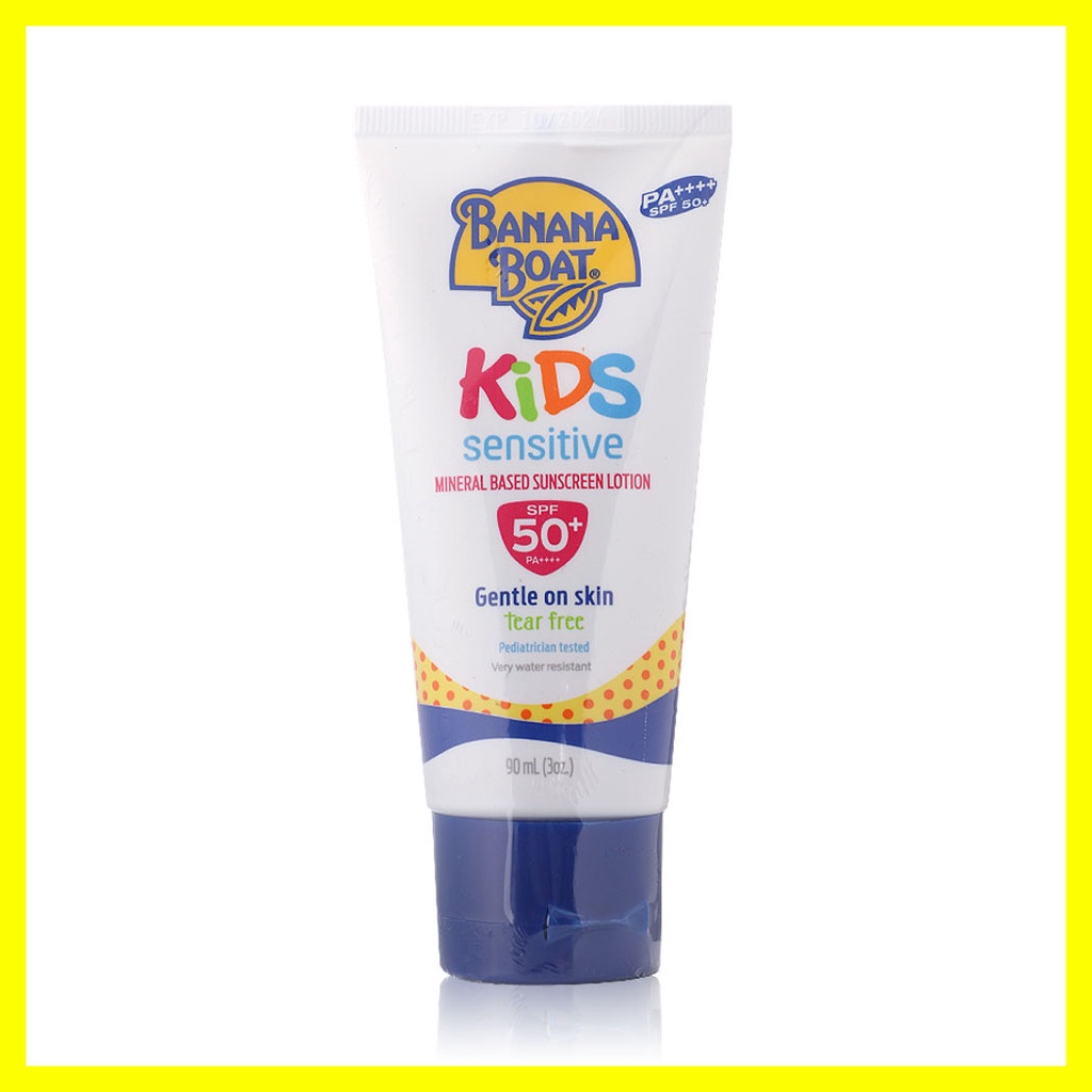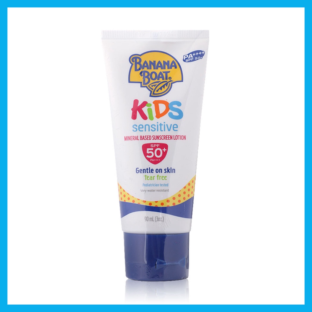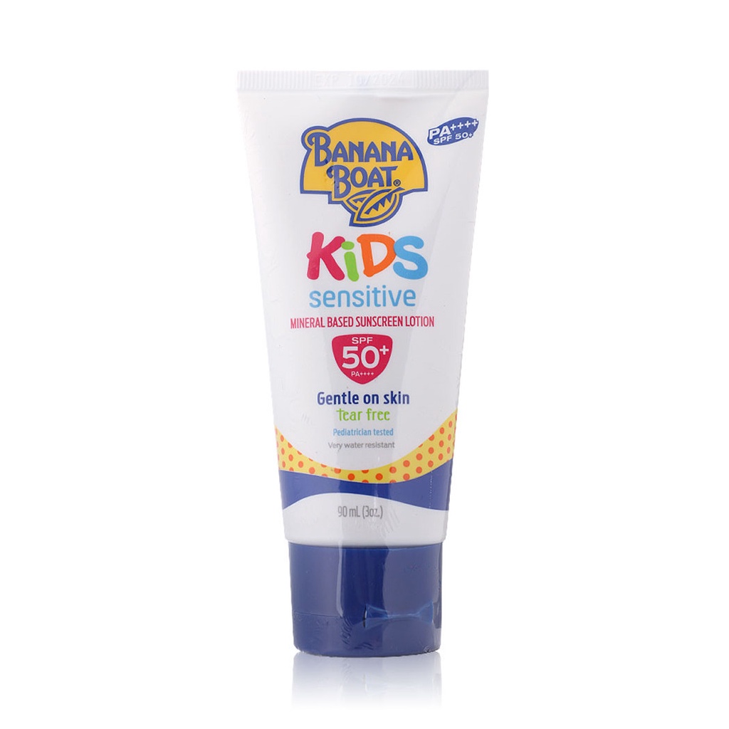 Banana BoatKids Sensitive Mineral Based SunScreen Lotion SPF50+ PA++++ 90mlโลชั่นกันแดดเป็นสูตร Provides broad spectrum UVA/UVB มากกว่า 50 เท่าโดยลดปริมาณสารเคมีลงถึง 25% ด้วยสูตรอ่อนโยนและบอบบางที่สุด สำหรับเด็กอายุ 2 ขวบขึ้นไปและผู้ที่มีผิวบอบบบางแพ้ง่ายจึงไม่ก่อให้เกิดการระคายเคืองกับเด็กสามารถออกกิจกรรมกลางแดด ว่ายน้ำทั้งในสระ ในทะเล เล่นทรายได้ อย่างไร้กังวล พร้อมสูตร Tear Free ไม่แสบตา กันน้ำและเหงื่อ ปราศจากน้ำมันและน้ำหอม ไม่เหนียวเหนอะหนะ ไม่มีส่วนผสมของ Oxybenzone & Parabens•โลชั่นกันแดดสำหรับเด็กอายุ 2 ขวบขึ้นไปและผู้ที่มีผิวบอบบบางแพ้ง่าย