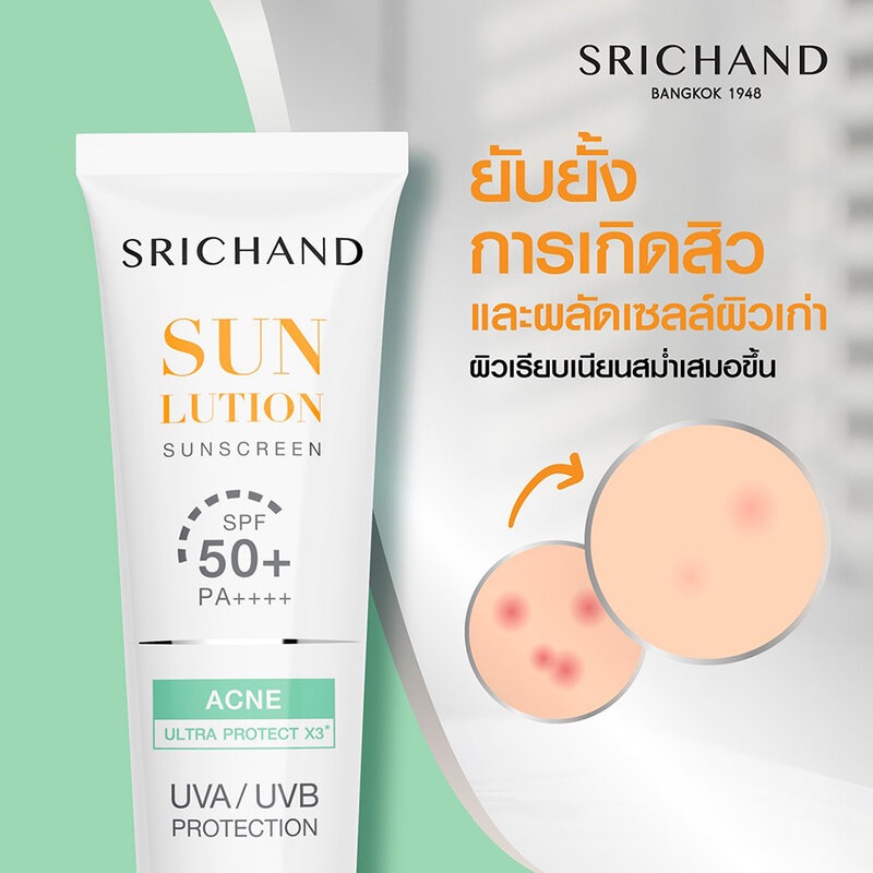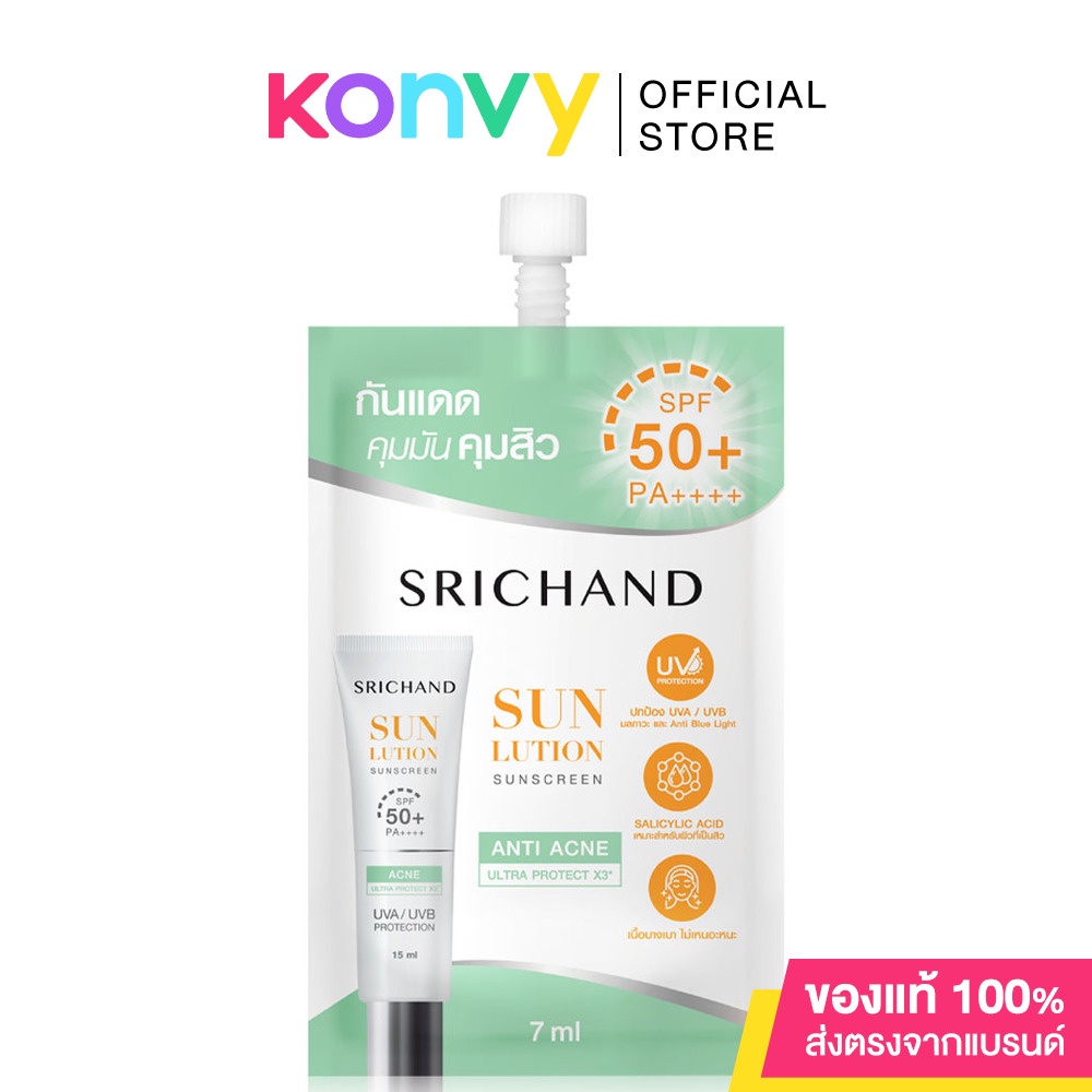 Cr: Facebook.com/srichand1948Srichand Sunlution Acne Care Sunscreen SPF50+ PA++++ 7ml sachet กันแดดสูตรแอคเน่แคร์กู้ผิวใสไกลสิว ช่วยปกป้องผิวจากรังสี UVA และ UVB ในแสงแดด ป้องกันการเกิด photo aging อันเนื่องมาจากแสงสีฟ้า และยังช่วยปกป้องผิวจากมลภาวะภายนอก เนื้อบางเบาเกลี่ยง่าย ลดความมันส่วนเกิน ล้างออกง่าย จัดการสาเหตุของการเกิดสิวอย่างอ่อนโยน