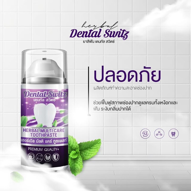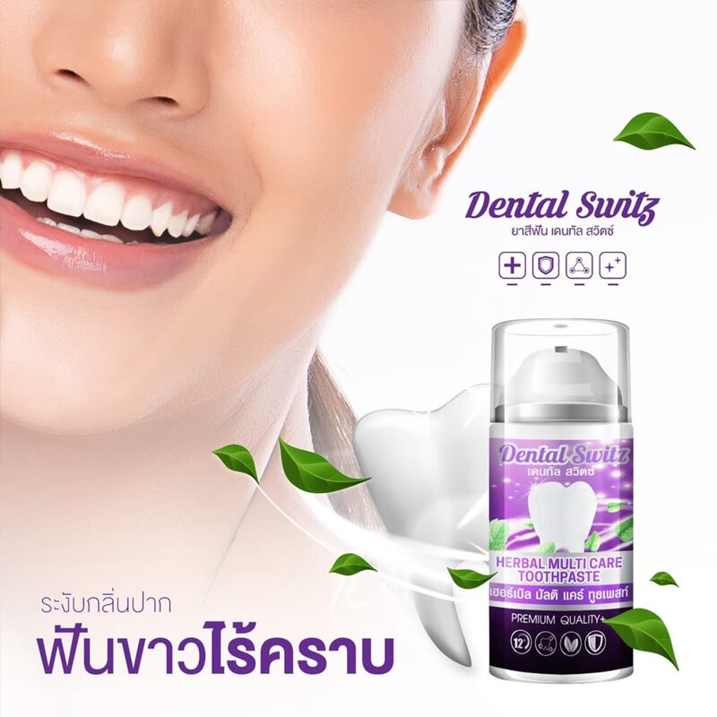 Cr.facebook.com/Dentalswitz.shopsDental Switz Herbal Multi Care Toothpaste 50ml + Guard Mouth 1pcsยิ้มอย่างมั่นใจด้วยยาสีฟันแบบขวดปั๊มช่วยฟื้นฟูสภาพช่องปากดูแลครบทั้งเหงือกและฟัน ช่วยลดอาการเสียวฟันคราบหินปูน ขจัดแบคทีเรียสะสมในช่องปาก มีฟลูออไรด์เคลือบผิวฟัน ผสานสารสกัดสมุนไพร ระงับกลิ่นปากได้ดี เพื่อช่องปากสะอาด เย็น สดชื่น