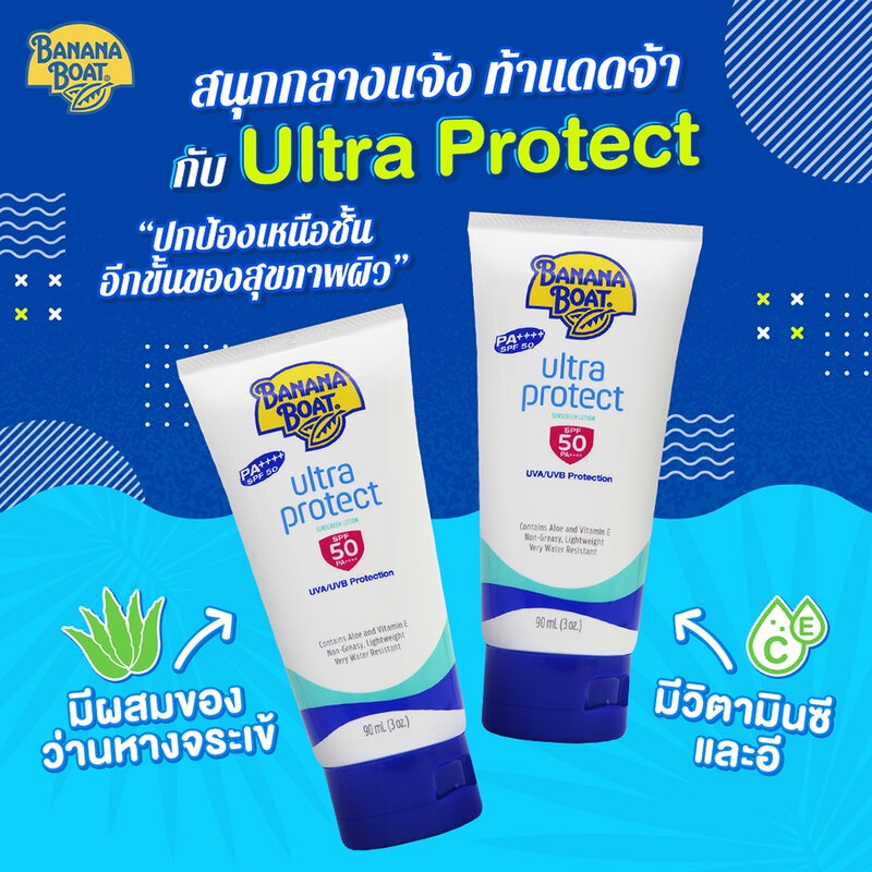 Banana Boat Ultra Protect Sunscreen Lotion SPF 50 PA+++ 90mlโลชั่นกันแดดสำหรับปกป้องผิวที่ใช้ได้เป็นประจำทุกวัน เนื้อครีมบางเบา ซึมซาบเร็ว ไม่อุดตันรูขุมขน มีส่วนผสมของว่านหางจระเข้ มีวิตามินซีและอี ช่วยให้ผิวเนียนนุ่มชุ่มชื่น ช่วยปกป้องผิวจากการเผาไหม้ของแสงแดดถึง 50 เท่า ทั้งรังสี UVA และ UVB ซึ่งเป็นสาเหตุของริ้วรอยและผิวหนัง พร้อมกันน้ำดีเยี่ยม คงประสิทธิภาพในการกันแดดได้ยาวนานกว่าBanana Boat Sport Ultra Sunscreen LotionSPF50+ PA++++90mlโลชั่นกันแดดสำหรับกีฬาทุกชนิด เนื้อครีมบางเบา ไม่เหนียวเหนอะหนะ ซึมซาบเร็ว ไม่อุดตันรูขุมขน ช่วยปกป้องผิวจากการเผาไหม้ของแสงแดดได้มากกว่า 50 เท่า พร้อมปกป้องทั้งรังสียูวีเอและยูวีบี กันแดดได้ยาวนาน กันน้ำได้ดีเยี่ยม