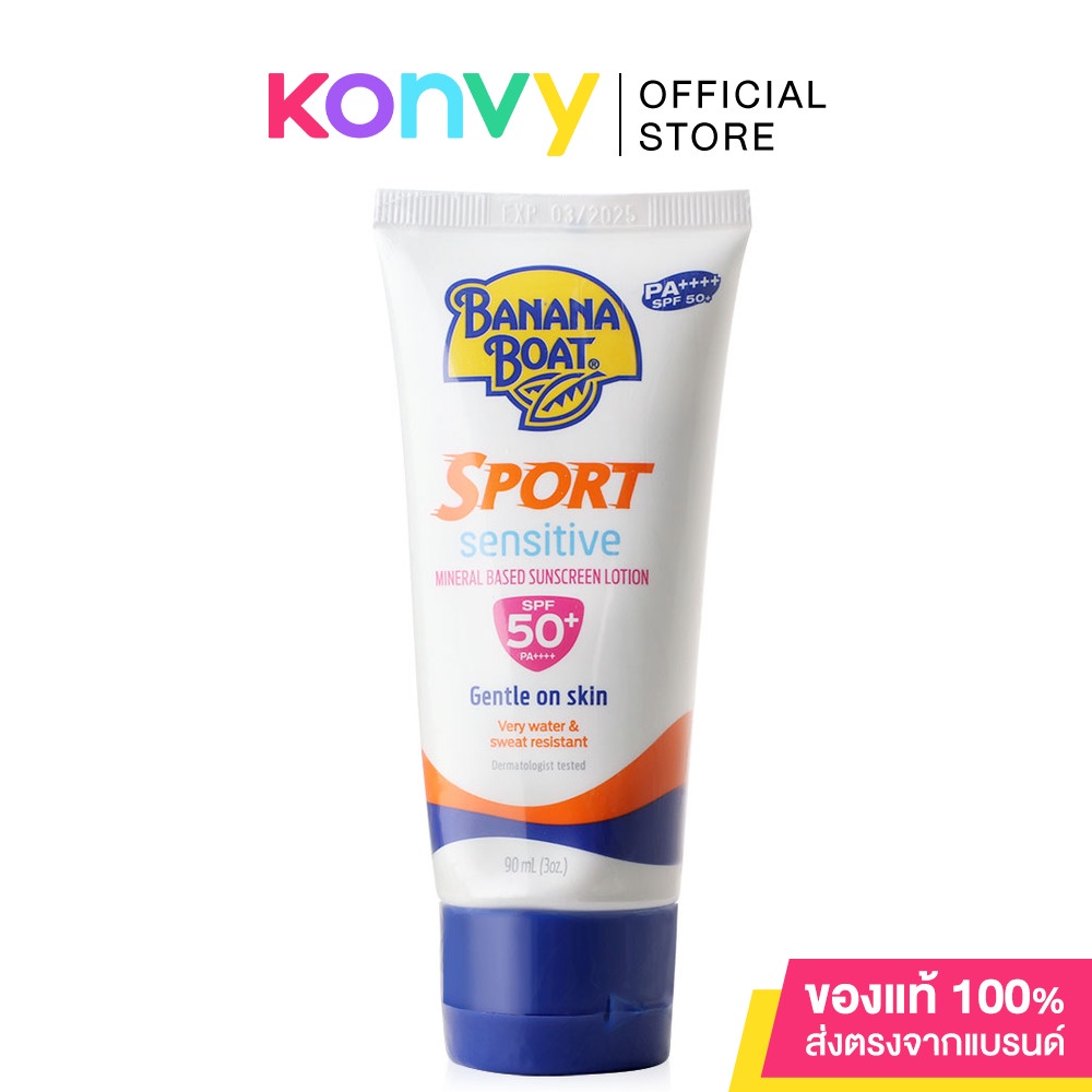 Banana Boat Sport Sensitive Sunscreen Lotion SPF50+ PA++++โลชั่นปกป้องแสงแดด เป็นสูตร Provides broad spectrum UVA/UVB มากกว่า 50 เท่าโดยลดปริมาณสารเคมีลงถึง 25% เนื้อโลชั่นบางเบาไม่เหนียวเหนอะหนะ ไม่มีส่วนผสมของ oxybenzone & parabens ไม่มีน้ำมันและน้ำหอม ช่วยให้คุณได้สนุกกับครอบครัวทั้งว่ายน้ำและออกแดดกลางแจ้งได้อย่างไร้กังวล ปราศจากน้ำมันและน้ำหอม ไม่เหนียวเหนอะหนะ ไม่มีส่วนผสม Oxybenzone & Parabens