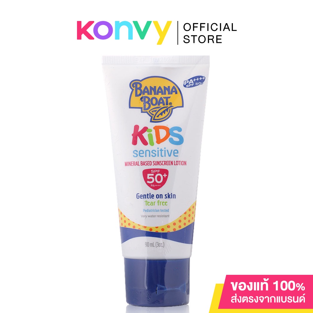 Banana BoatKids Sensitive Mineral Based SunScreen Lotion SPF50+ PA++++ 90mlโลชั่นกันแดดเป็นสูตร Provides broad spectrum UVA/UVB มากกว่า 50 เท่าโดยลดปริมาณสารเคมีลงถึง 25% ด้วยสูตรอ่อนโยนและบอบบางที่สุด สำหรับเด็กอายุ 2 ขวบขึ้นไปและผู้ที่มีผิวบอบบบางแพ้ง่ายจึงไม่ก่อให้เกิดการระคายเคืองกับเด็กสามารถออกกิจกรรมกลางแดด ว่ายน้ำทั้งในสระ ในทะเล เล่นทรายได้ อย่างไร้กังวล พร้อมสูตร Tear Free ไม่แสบตา กันน้ำและเหงื่อ ปราศจากน้ำมันและน้ำหอม ไม่เหนียวเหนอะหนะ ไม่มีส่วนผสมของ Oxybenzone & Parabens