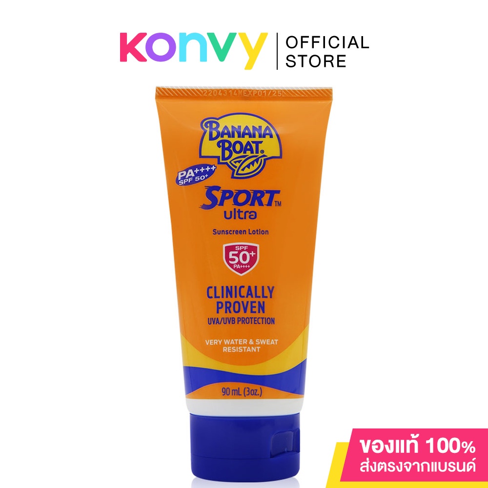 Banana Boat Sport Ultra Sunscreen Lotion SPF 50 PA++++ 90mlผลิตภัณฑ์โลชั่นกันแดด ออกแบบมาเฉพาะสำหรับผู้ที่ชื่นชอบการออกกำลังกายทำกิจกรรมกลางแจ้ง เช่น ดำน้ำ เทนนิส วิ่ง ขี่จักรยานฯ ไม่มีส่วนผสมของน้ำหอมที่ระคายเคืองต่อผิว สูตรใหม่ซึมซับเร็วไม่เหนียวเหนอะหนะ ไม่อุดตันรูขุมขน และลื่นเมื่อต้องจับอุปกรณ์กีฬา กันน้ำดีเยี่ยม