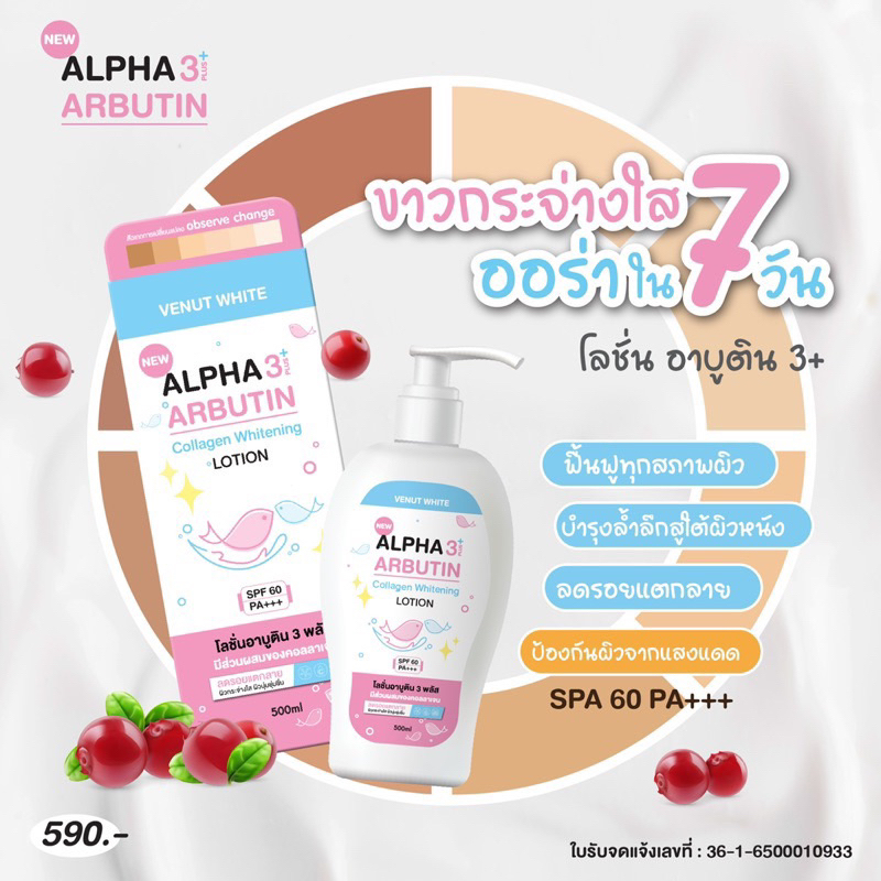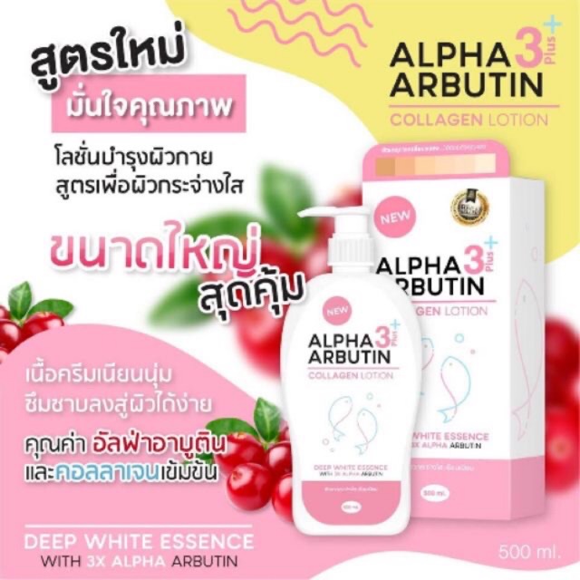 โลชั่นอัลฟ่าอาร์บูติน คอลลาเจน Alpha Arbutin Callagen Lotion SPF60 By Veenut White ขนาด 500ml.เผยผิวใหม่ขาวเนียนยิ่งขึ้น ด้วยสูตรอัลฟ่าอาร์บูติน ผสมคอลลาเจน สตอรบอรี่ แอปเปิ้ลเขียว ผสมผสาม กับกลูต้าโธโอน วิตามิน ซี วิตามิน อี ซึ่งเป็น ส่วนผสมที่ ช่วยขจัดริ้วรอย เหี่ยวย่น กระ แผลเป็น ผิวแห้แตกลาย ให้จางลง ลดผดผื่นคันแพ้สารเคมี ช่วยให้ผิวขาวใส มีออร่า ผิวเนียน นุ่มใส พร้อม กลิ่นหอม ชวนหลงใหล สะกดความขาวทุกสายตา