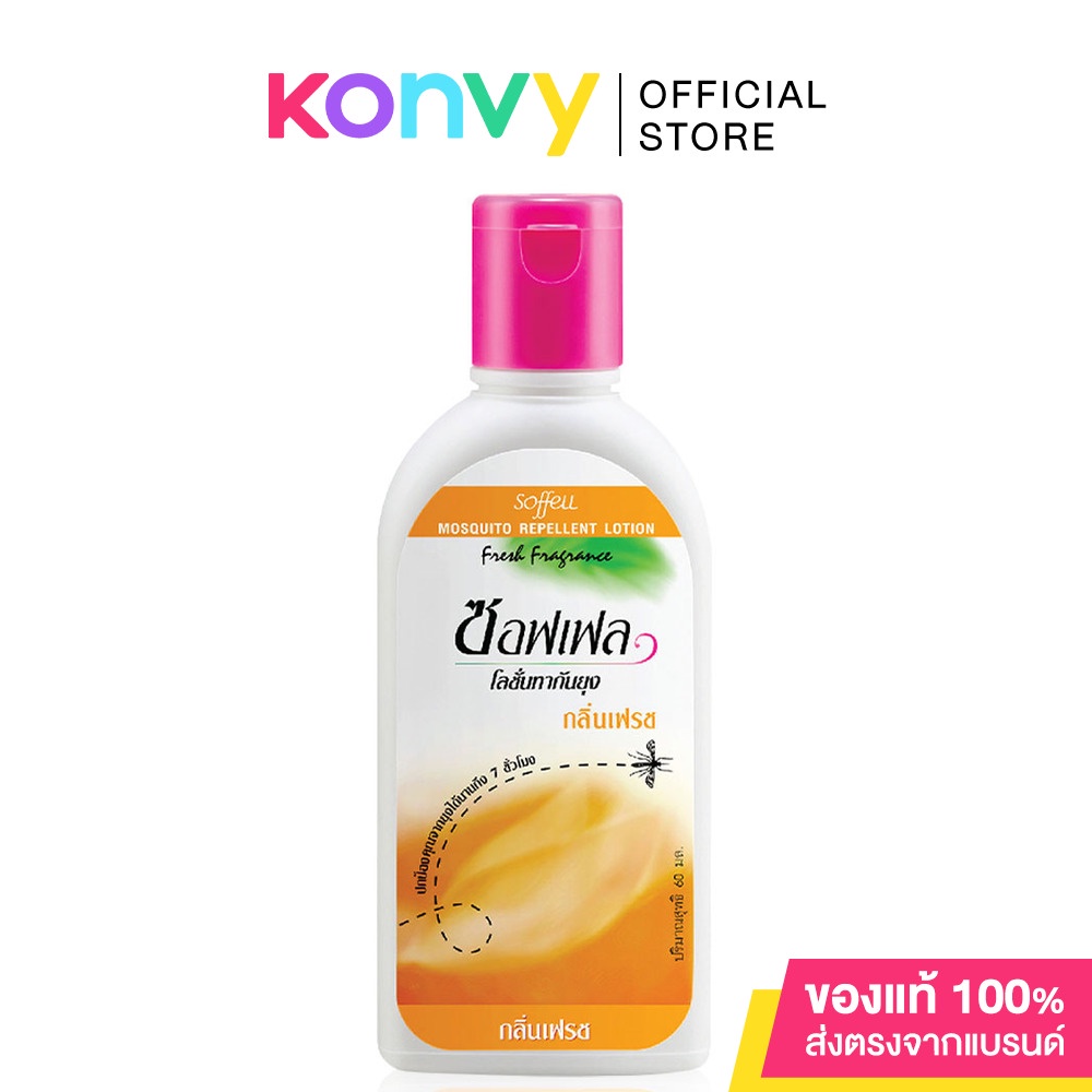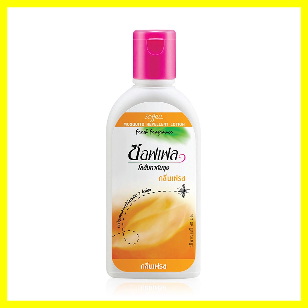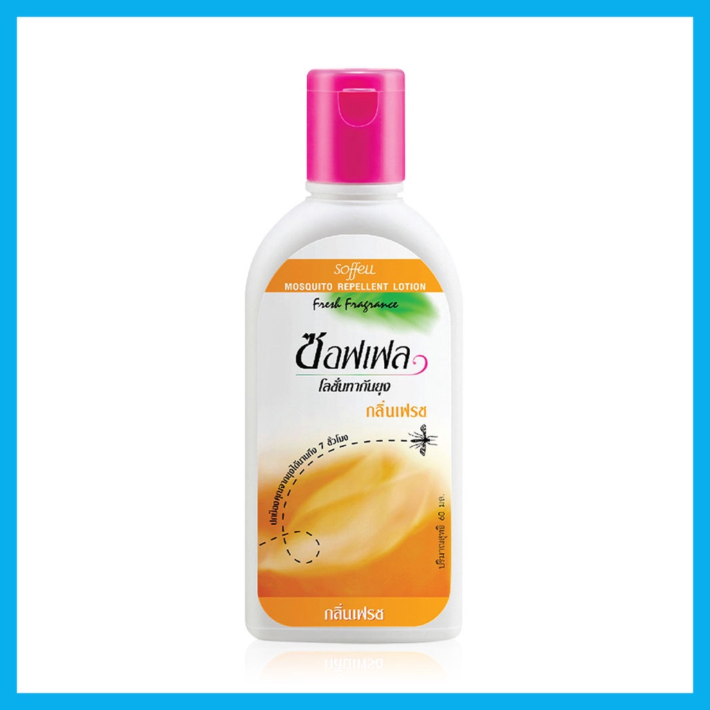 Cr.facebook.com/SoffellThailandSoffell Lotion Fresh 60ml กลิ่นหอมที่คนรัก ยุงเกลียดกับโลชั่นกันยุง กลิ่นเฟรชหอมพิเศษของซอฟเฟล ช่วยไล่ยุงร้ายได้อย่างมีประสิทธิภาพ โลชั่นเนื้อบางเบา ไม่ทำให้รู้สึกเหนียวเหนอะหนะ มีส่วนผสมมอยส์เจอไรเซอร์ช่วยบำรุงผิวให้นุ่มนวล ชุ่มชื้น พร้อมปกป้องคุณจากยุงร้ายได้ยาวนานถึง 7 ชั่วโมง ไม่มีส่วนผสมที่เป็นอันตราย ไม่ทำร้ายผิว สามารถใช้ได้เป็นประจำทุกวัน
