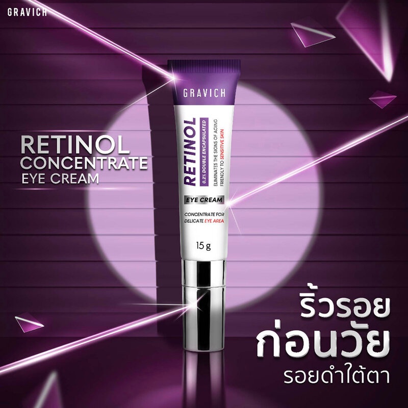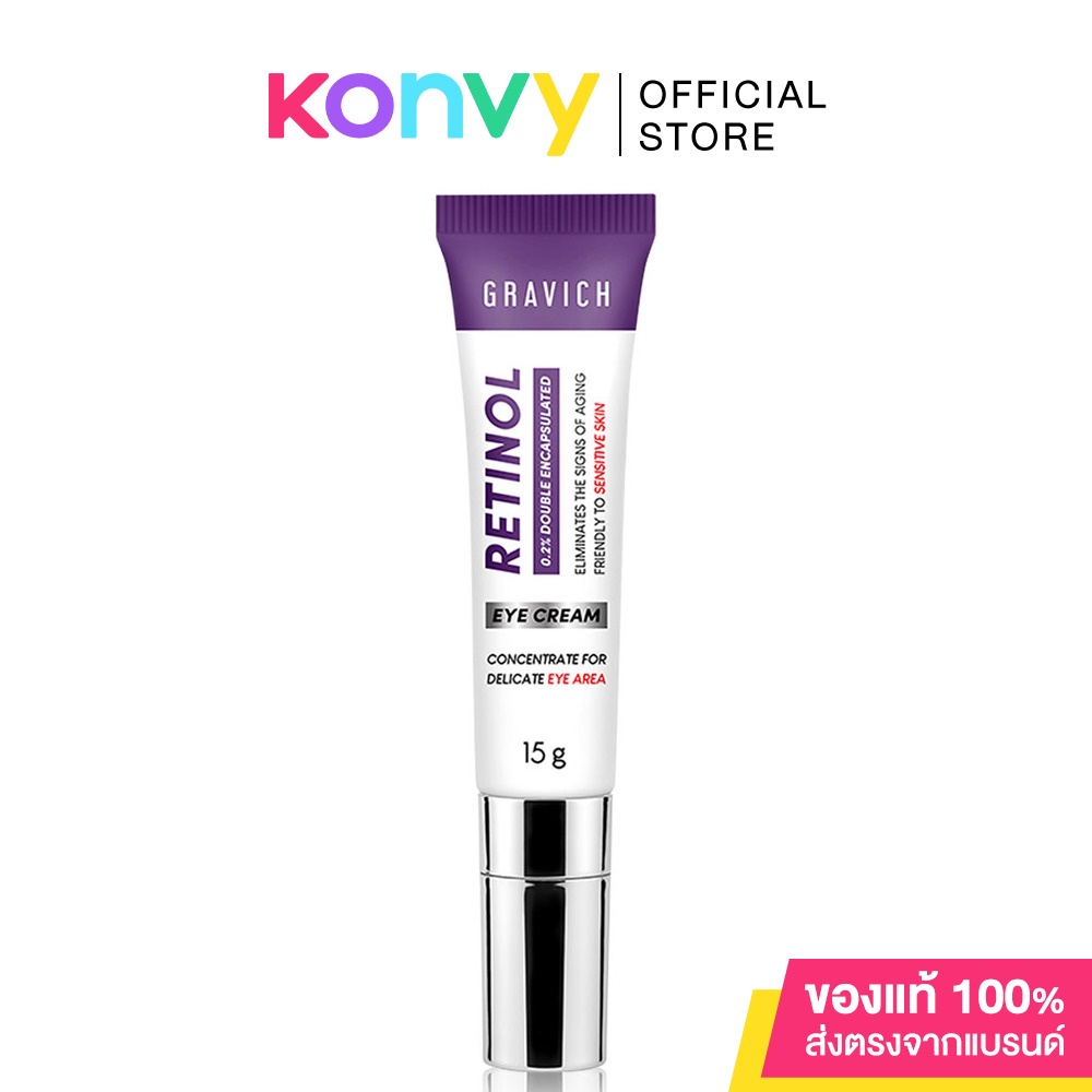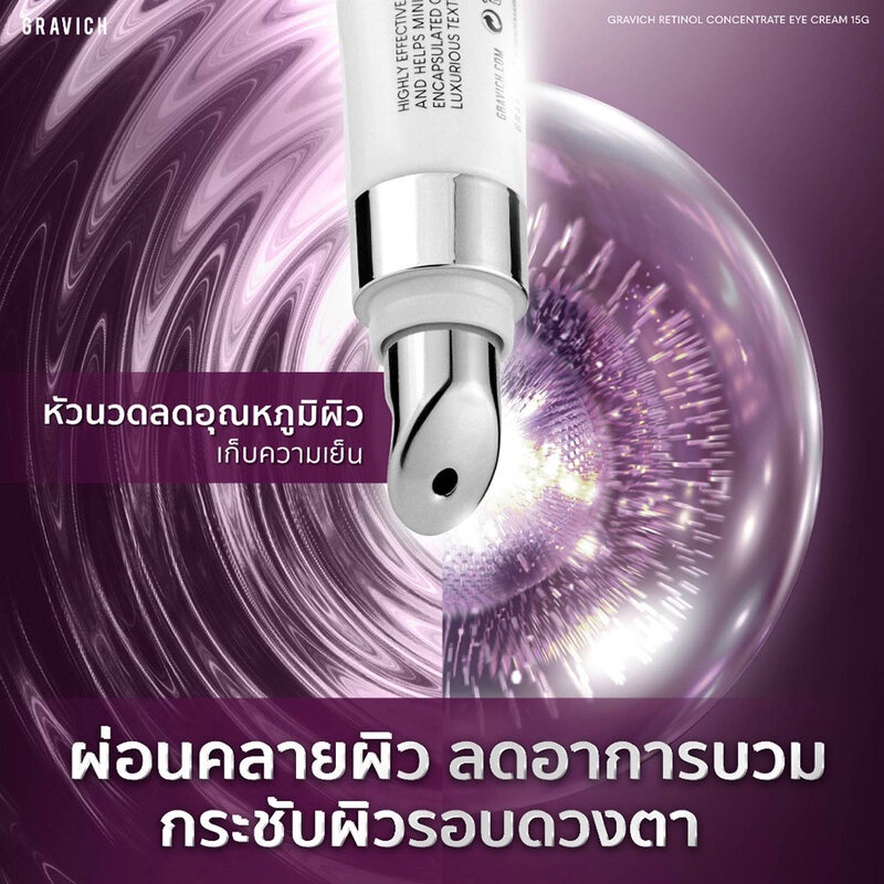 Cr.gravich.comGRAVICH Retinol Concentrate Eye Cream 15g ครีมลดริ้วรอยใต้ตาจากการคิดค้นสูตร จนได้อัตราส่วนที่ลงตัวเฉพาะ Gravich วิตามินเอในรูปแบบ Sensitive Retinol อ่อนโยนพิเศษใช้ได้กับบริเวณผิวรอบดวงตา ด้วยนวัตรกรรมใหม่! Double Encapsulate ห่อหุ้มสารสำคัญด้วยโครงสร้างพิเศษ สองชั้น ส่งประสิทธิภาพเข้มข้นตรงจุด ผสานการทำงานร่วมกันกับ Biomimetic Botox-Like Peptide ทำให้ร่องรอยแห่งวัยลดลง ร่วมกับกลุ่มเติมน้ำให้ผิวอย่าง Panthenol, Hyaluronic acid และ Bisabolol ให้ความชุ่มชื้นส่งเสริมการทำงานของการสังเคราะห์คอลลาเจนใต้ผิวหนัง ทำงานแบบ Triple Action ด้วยการลดความโทรม ยับยั้งริ้วรอย และเพิ่มผิวอิ่มฟู เนื้อสัมผัส ครีมเนื้อกำมะหยี่นุ่ม บางเบา ซึมไว เกลี่ยง่าย ไม่หนักผิว เหนอะหนะ ไม่มีส่วนประกอบที่เกิดไอระเหยทำให้แสบตา หรือก่อการระคายเคือง