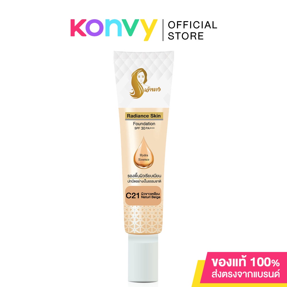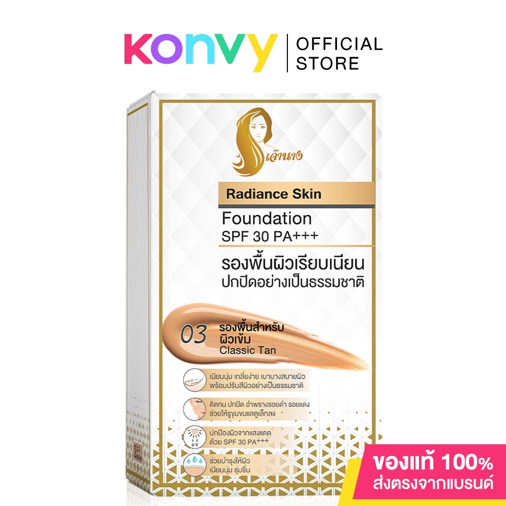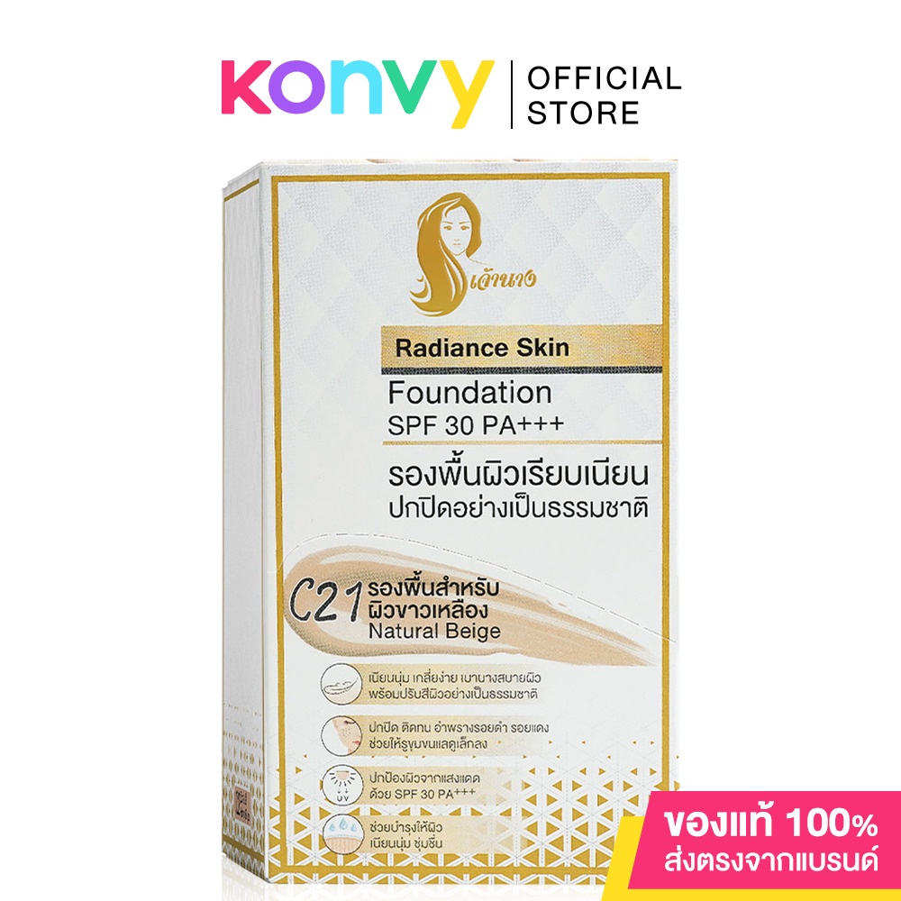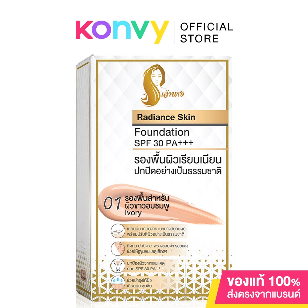 Chaonang Radiance Skin Foundation SPF30PA+++ 15g #01 Ivory รองพื้นเนื้อลิควิด มอบสัมผัสเนียนนุ่ม บางเบาสบายผิว เกลี่ยง่าย ไม่เหนียวเหนอะหนะ ปกปิด ติดทน อำพรางรอยดำ รอยแดง เบลอรูขุมขนให้แลดูเล็กลง พร้อมปรับสีผิวให้สม่ำเสมออย่างเป็นธรรมชาติ ด้วยสารสกัดพิเศษที่เพิ่มการบำรุงผิวให้คุณ เป็นมากกว่ารองพื้นเพราะผสานการบำรุงให้ผิวแลดูกระจ่างใสด้วย Brightening Booster พร้อม Double Moist Complex ช่วยให้ผิวเนียนนุ่ม ชุ่มชื้น พร้อมปกป้องผิวจากแสงแดดด้วย SPF30PA+++ และเทคโนโลยี Silky Soft Dry Powder ผงแป้งที่ให้คุณสมบัติช่วยดูดซึมความมันบนใบหน้า ไม่เยิ้มระหว่างวัน ไม่มันวาว มอบลุค Natural Finish Look สวยใสในแบบธรรมชาติ• #01 Ivory ผิวขาวอมชมพู