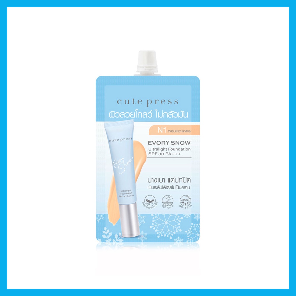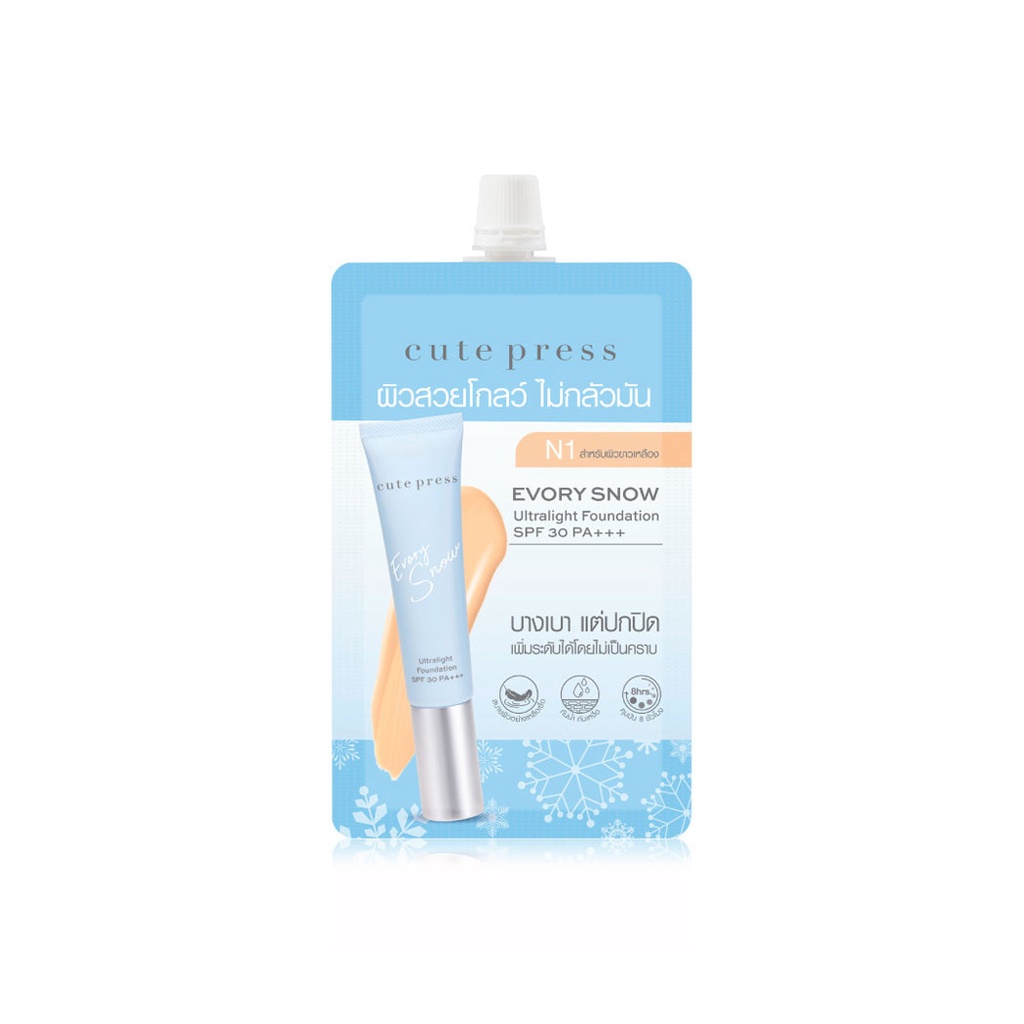Cr: Facebook.com/cutepressCute Press Evory Snow Ultralight Foundation SPF30/PA+++ 5g #N1 ครั้งแรกของรองพื้นเนื้อโกลว์ที่เหมาะกับอากาศเมืองไทย เนื้อสัมผัสนุ่ม เกลี่ยง่าย แนบสนิทไปกับผิว ให้ความรู้สึกเบาสบายผิวอย่างเหลือเชื่อ พร้อมด้วย Invisible Snowflex ที่กระจายแสงให้ผิวอย่างธรรมชาติ ให้ผิวคุณดูสวยโกลว์สุขภาพดี เนื้อรองพื้นให้การปกปิดระดับกลาง และสามารถทาทับเพื่อเพิ่มระดับการปกปิดได้โดยไม่เป็นคราบ ที่สำคัญ สามารถช่วยควบคุมความมันยาวนาน 8 ชั่วโมง พร้อมประสิทธิภาพในการกันน้ำ กันเหงื่อและปกป้องผิวจากรังสี UVA และ UVB ด้วย SPF 30 PA+++ ให้ผิวคุณเนียนสวยกระจ่างใสได้ตลอดวัน สูตรปราศจาก Mineral Oil น้ำหอม และพาราเบน