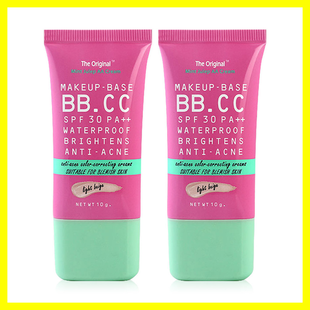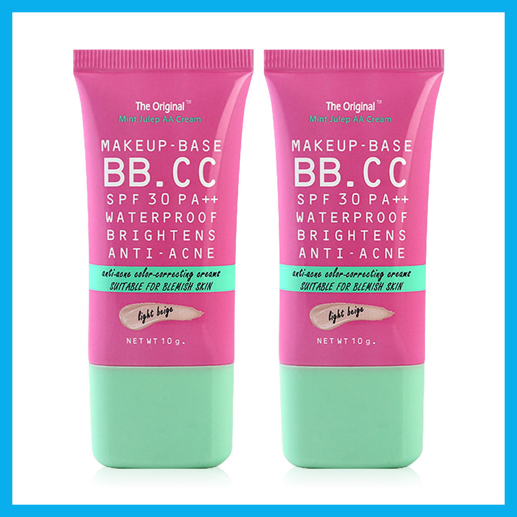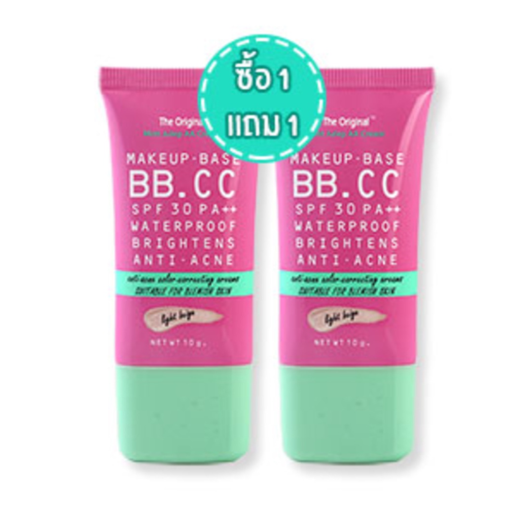 The Original Makeup-Base BB CC SPF30/PA++ Waterproof Brightens Anti-Acne [10g x 2pcs] #Light Beigeผลิตภัณฑ์รองพื้นและบำรุงผิวหน้า ผสมสารป้องกันแสงแดด สูตรสำหรับคนเป็นสิว ผสานคุณค่าสารสกัดจากมิ้นท์และที ทรีออยล์ เนื้อครีมบางเบา ไม่เหนียวเหนอะหนะ ไม่หนักหน้า เมื่อทาลงบนผิวแล้ว จะแตกตัวเป็นน้ำ ช่วยปรับสีผิวให้กระจ่างใสขึ้น ปกปิดรอยดำจากสิว ทำให้ผิวหน้าเรียบเนียนใสตลอดทั้งวันก่อนการแต่งหน้า บีบปริมาณเล็กน้อย เกลี่ยเบาๆให้ทั่วใบหน้า สามารถใช้ซ้ำได้ในระหว่างวัน