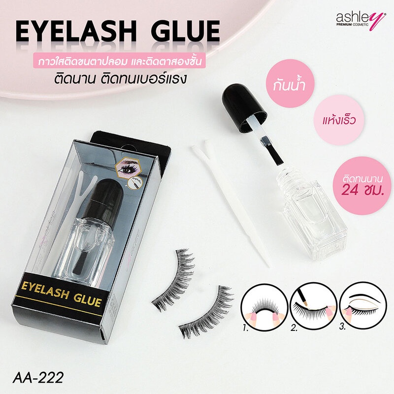 Cr. facebook.com/AshleycosmeticsthailandAshley Eyelash Glue 6ml กาวใสติดขนตาปลอม และติดตาสองชั้น ติดง่าย แน่น ให้ดูเนียนเป็นธรรมชาติ สูตรกันน้ำ กันเหงื่อ ติดทนนาน ไม่หลุดระหว่างวัน และไม่ทำให้ระคายเคืองอ่อนโยนต่อผิว