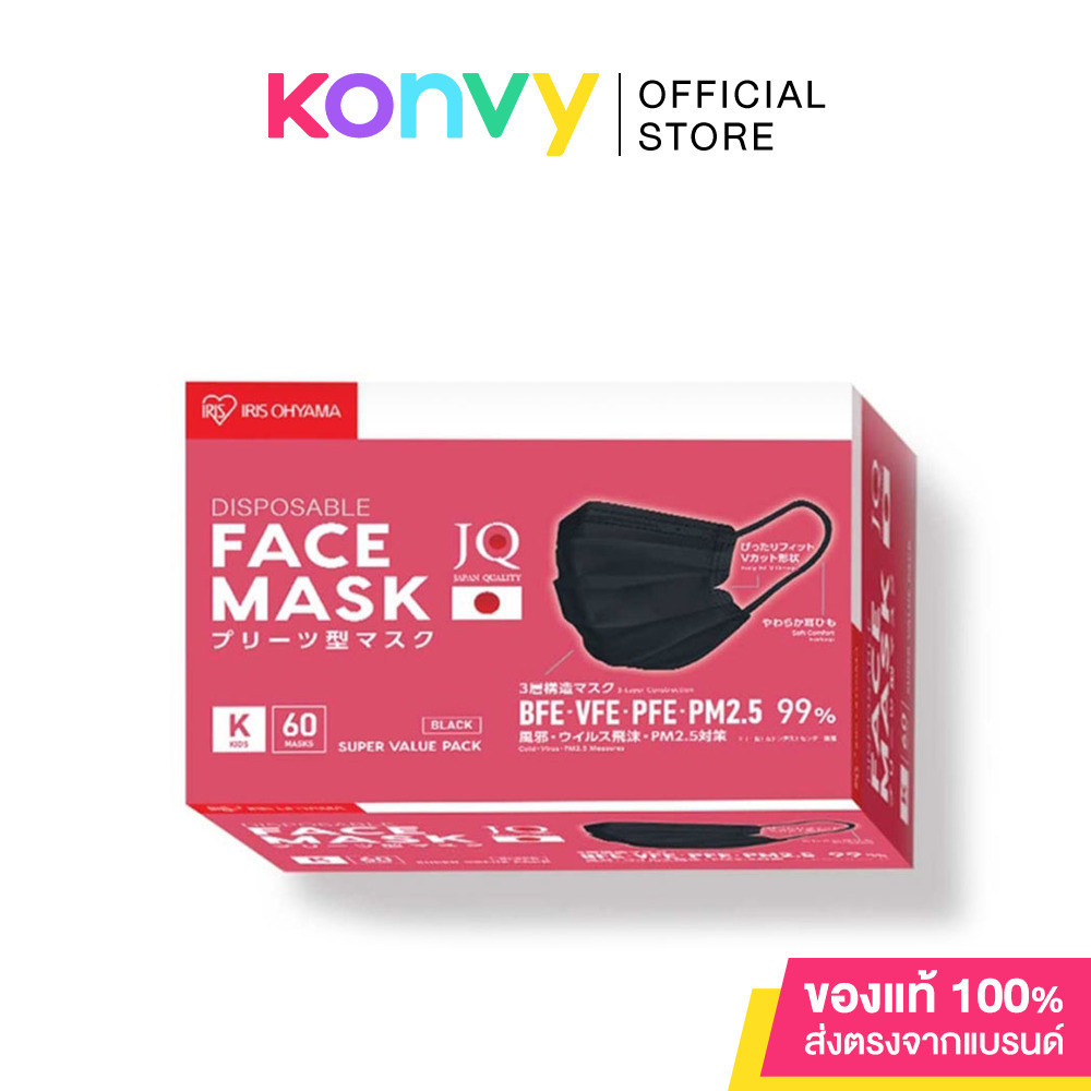 IRIS OHYAMA Disposable Face Mask Size M #Black [60pcs] หน้ากากอนามัย สีดำ ไซส์ M แบบ Pleated Mask สำหรับป้องกันฝุ่นละออง, PM2.5 และ เชื้อโรคได้อย่างมีประสิทธิภาพ หน้ากากอนามัยถูกออกแบบให้เป็นทรง V-cut ทำให้กระชับใบหน้ายิ่งขึ้น มาพร้อมสายคล้องนุ่มพิเศษ ให้ความรู้สึกสบาย ไม่ทำให้เจ็บหูแม้สวมใส่เป็นเวลานานรูปแบบของหน้ากากอนามัย