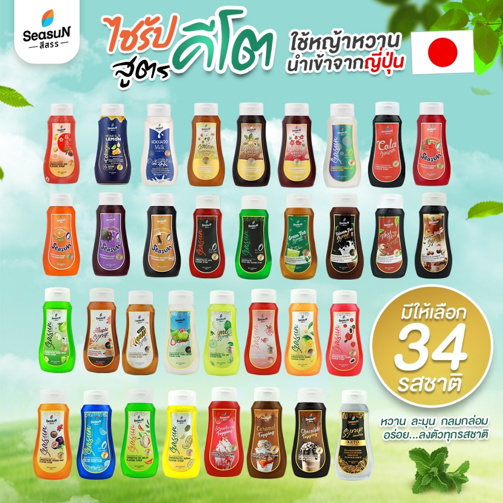 ไซรัปหญ้าหวาน ตราสีสรร 34 รสชาติไม่ให้พลังงาน ผลิตจากสารให้ความหวาน 3 ชนิด หญ้าหวาน อิริธิธอล และอินูลิน