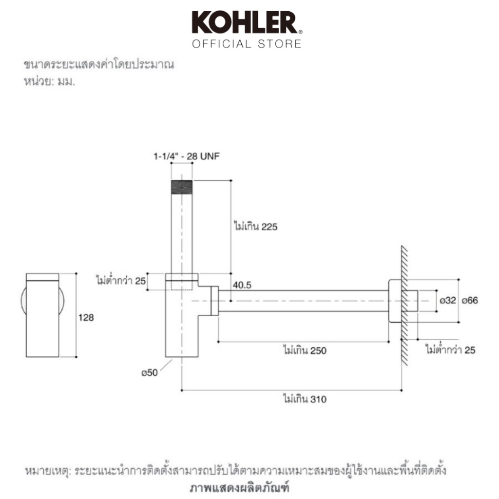 3. เลือกตำแหน่งรูน้ำทิ้งบนผนังไว้ล่วงหน้าโดยอ้างอิง ระยะการติดตั้ง เส้นผ่าศูนย์กลางของรูน้ำทิ้งควรใหญ่กว่า 32 มม. (33 - 36 มม.) รูน้ำทิ้งต้องยื่นออกจากผนังไม่เกิน 10 มม. ความยาวของท่อต้องมากกว่า ระยะห่างระหว่างรูน้ำทิ้งถึงทางน้ำเสียประมาณ 50 มม.