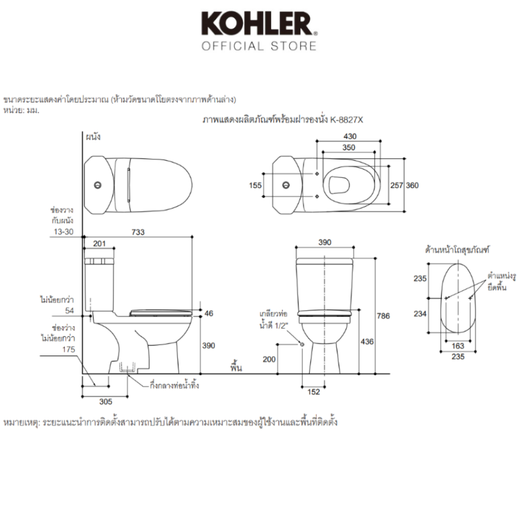 • จุดกึ่งกลางท่อน้ำาทิ้งห่างจากผนัง 305 มม.