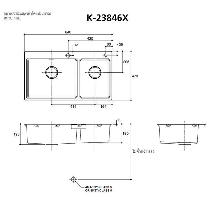 ขนาดเจาะฝังใต้เคาน์เตอร์ : 799 x 375, R10.5 mm