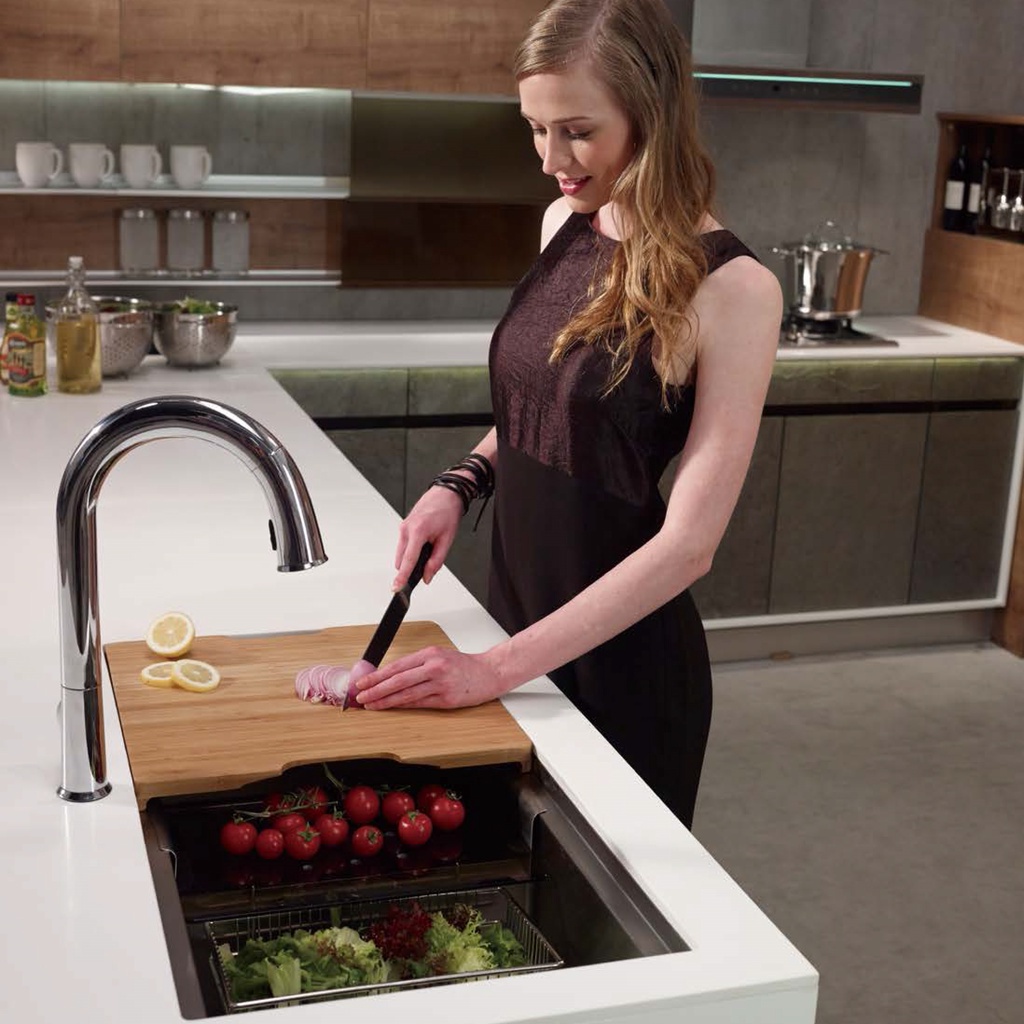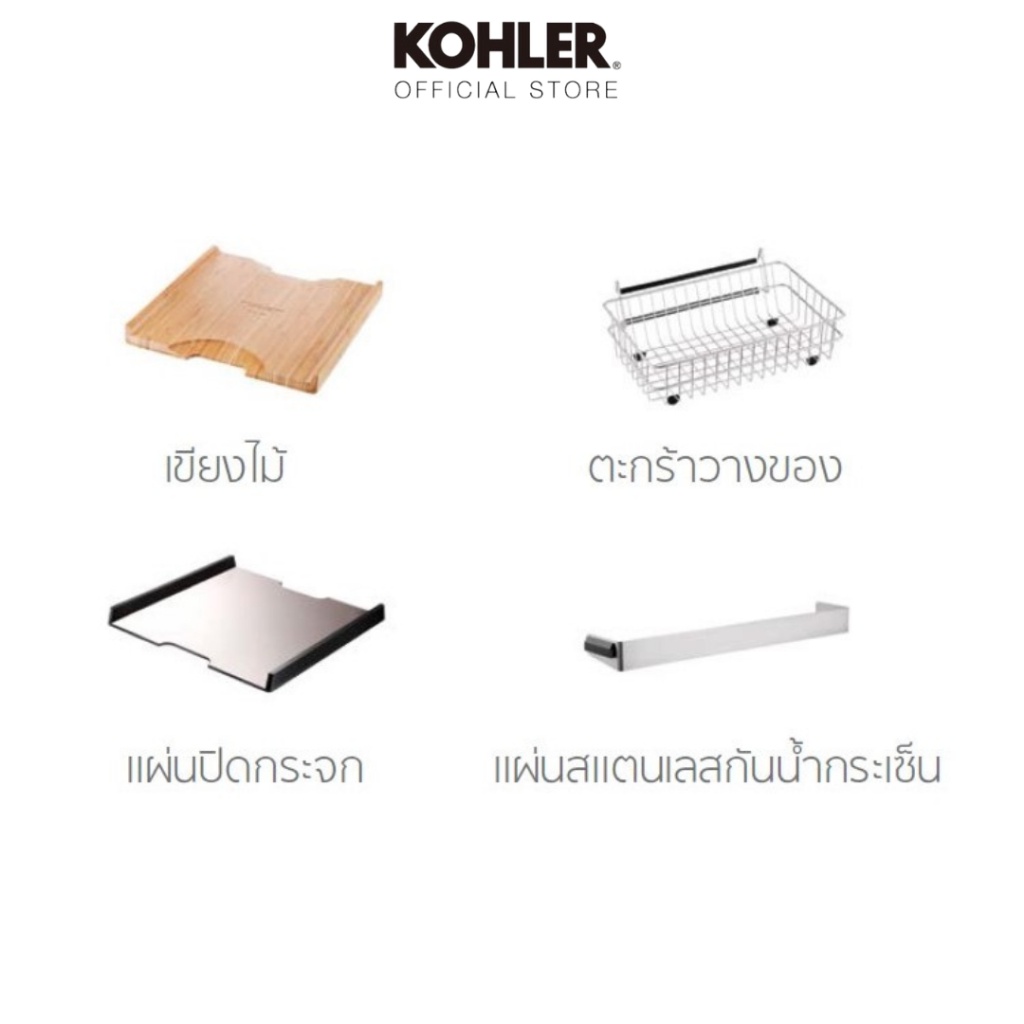 พร้อมท่อน้ำทิ้ง, ท่อน้ำล้น, สะดืออ่างล้างจาน, แผ่นปิดกระจก, เขียงไม้, ตะกร้าวางของ, และแผ่นสเตนเลสกันน้ำกระเซ็น