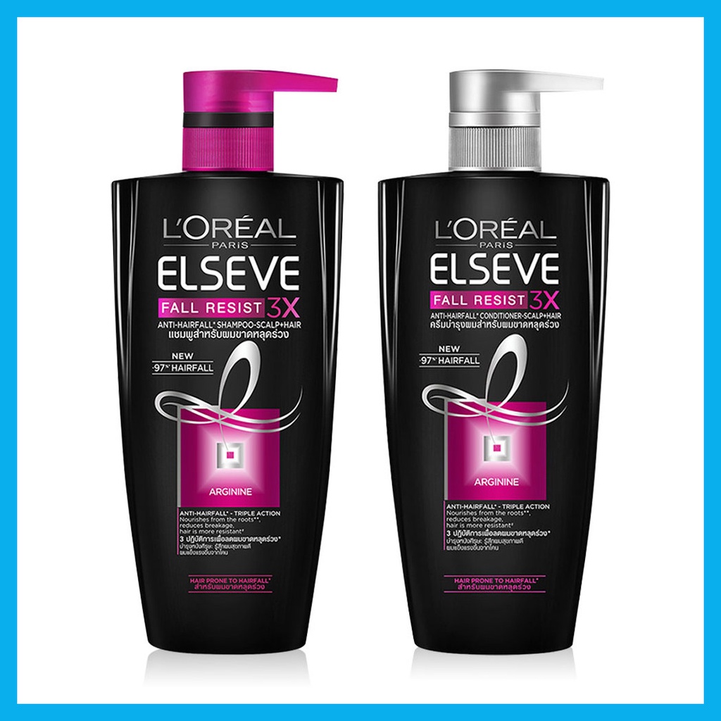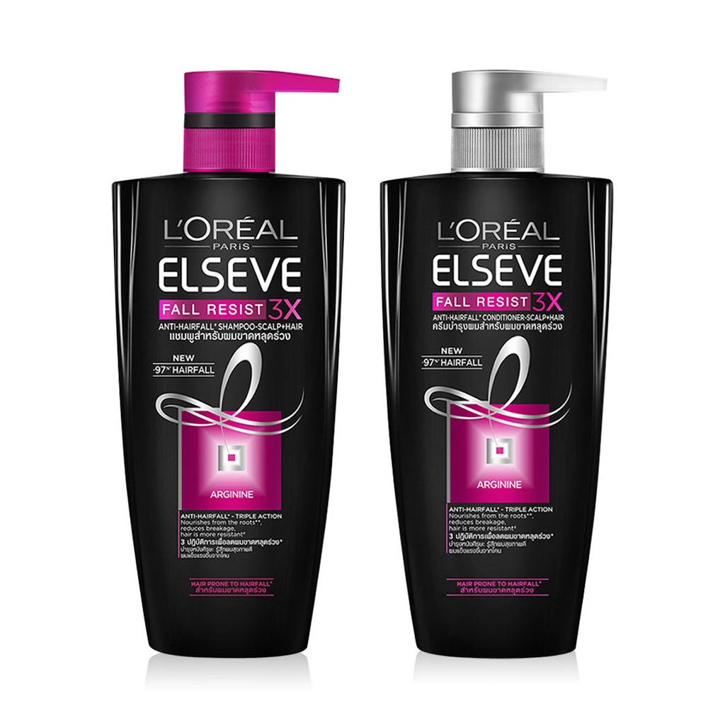 L'Oréal Paris Set 2 Items Elseve Fall Resist Shampoo 410ml+ Elseve Fall Resist 3X Anti-Hairfall Conditioner 410mlเซทแชมพูและครีมนวดผม สูตรฟื้นบำรุงล้ำลึกถึงหนังศีรษะ ลดผมขาดหลุดร่วง ด้วยคุณค่าของอาร์จินีน ช่วยบำรุงล้ำลึกถึงหนังศีรษะ ให้ผมแข็งแรงจากโคนจรดปลาย• บำรุงลึกจากโคนผม