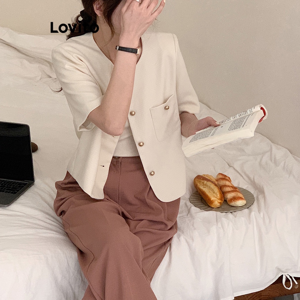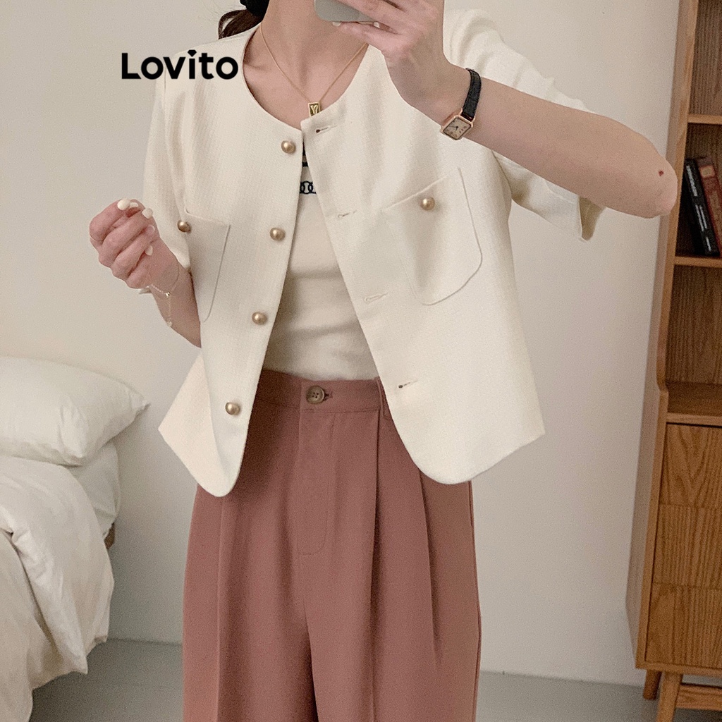 Lovito Áo blazer nữ có khuy màu trơn thường ngày l58ad063 (Màu Trắng nhạt)