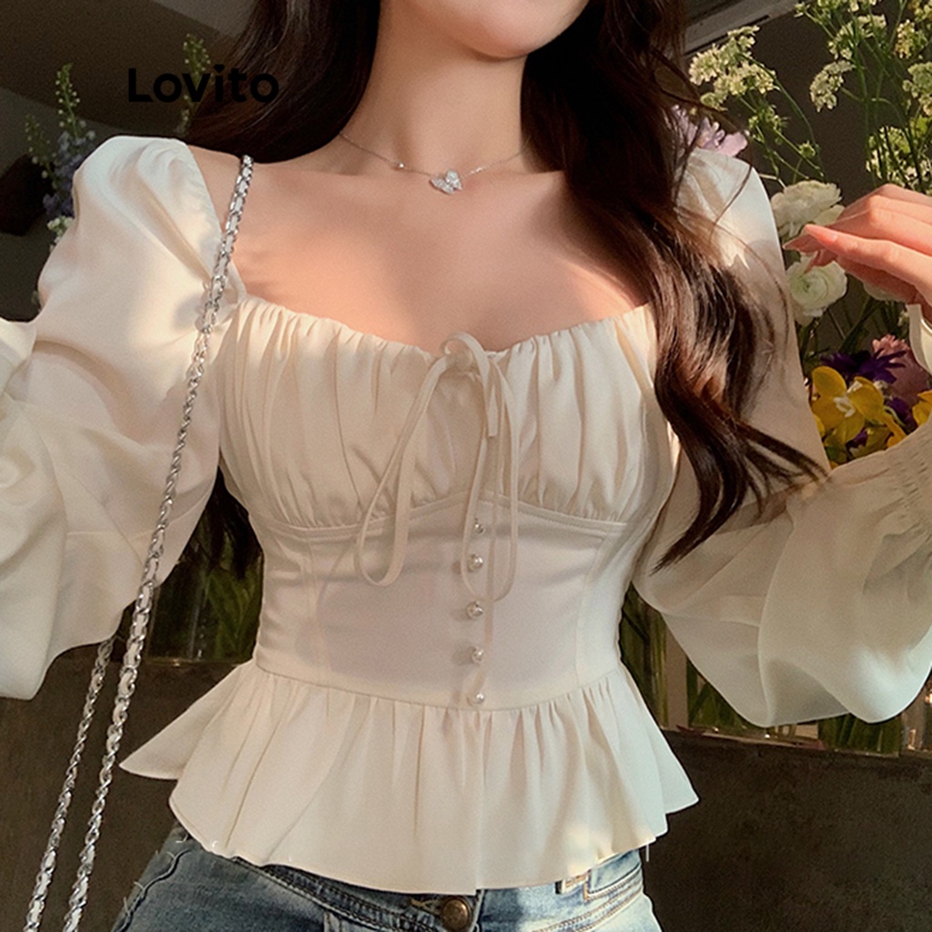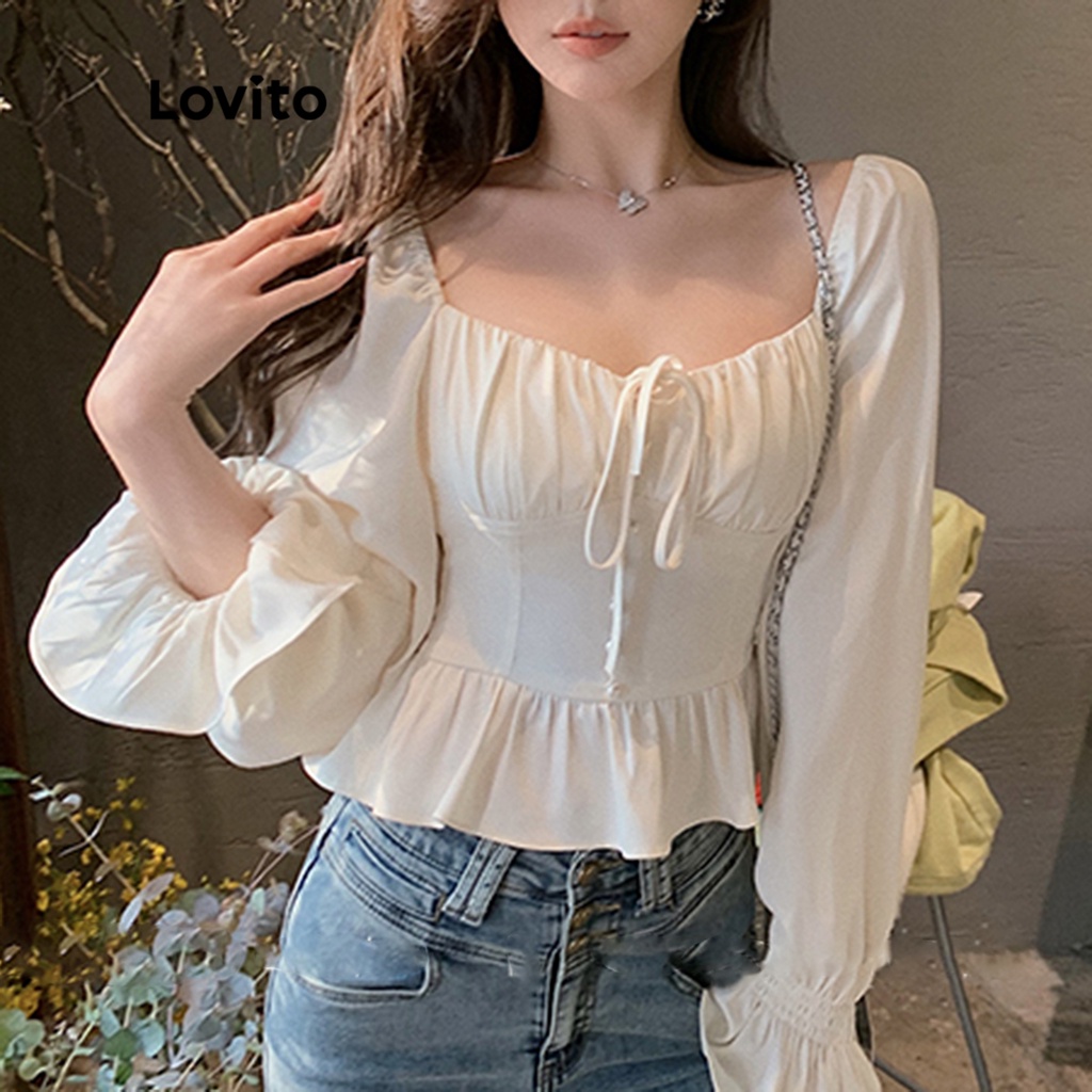 Lovito áo kiểu có cúc buộc dây màu trơn thường ngày cho Nữ lna17214 (Hoa mai)