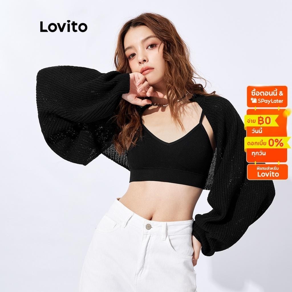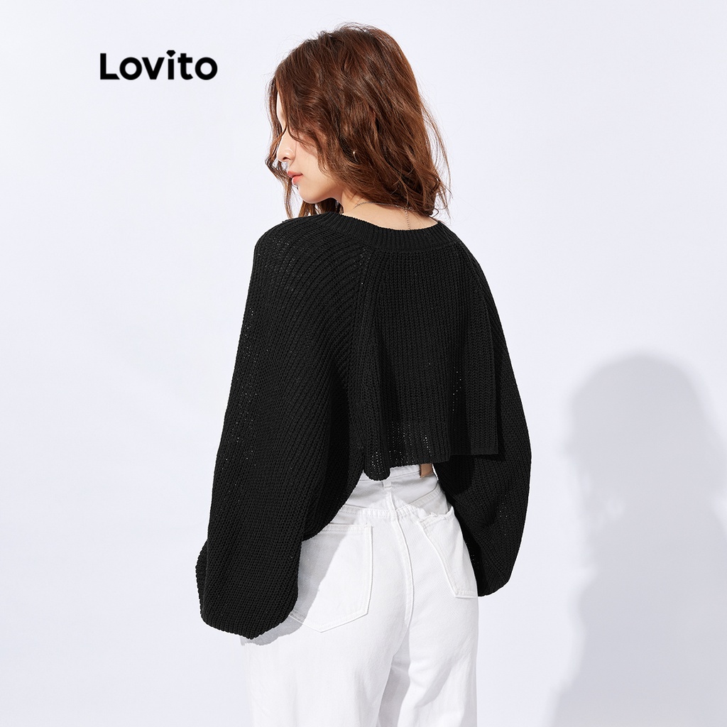 Lovito Áo len dệt kim vành màu trơn thường ngày cho Nữ lna07151 (Màu Đen)