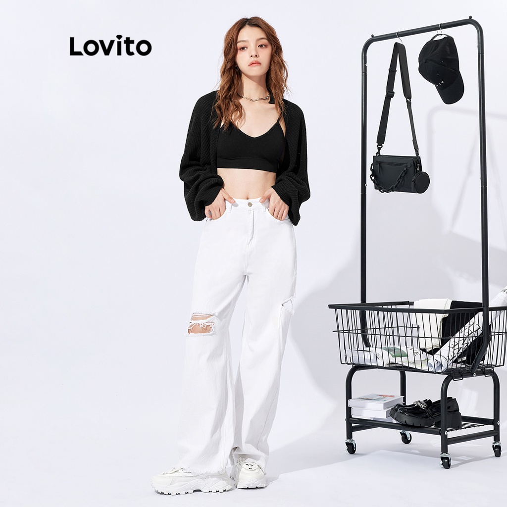 Lovito Áo cardigan dài tay trơn có dây buộc cho nữ lna06032 (Màu Trắng/Đen)