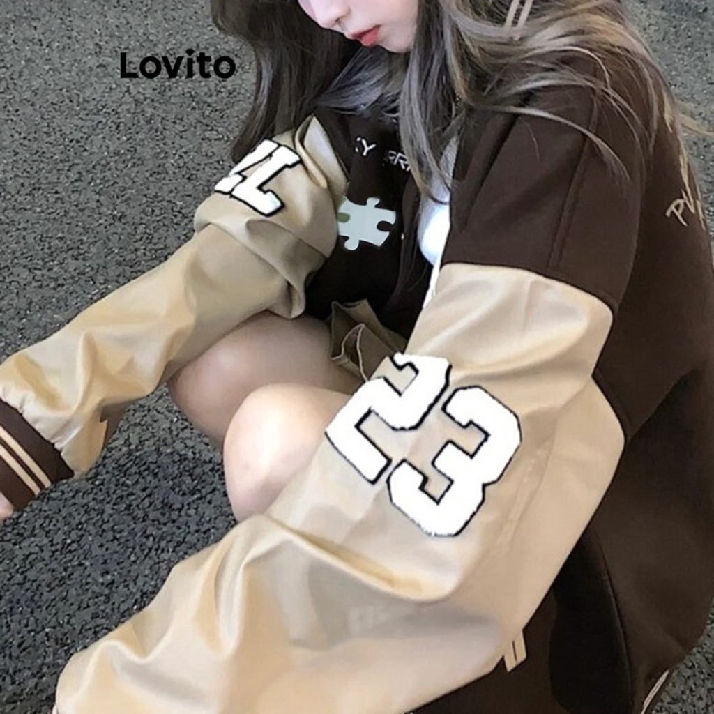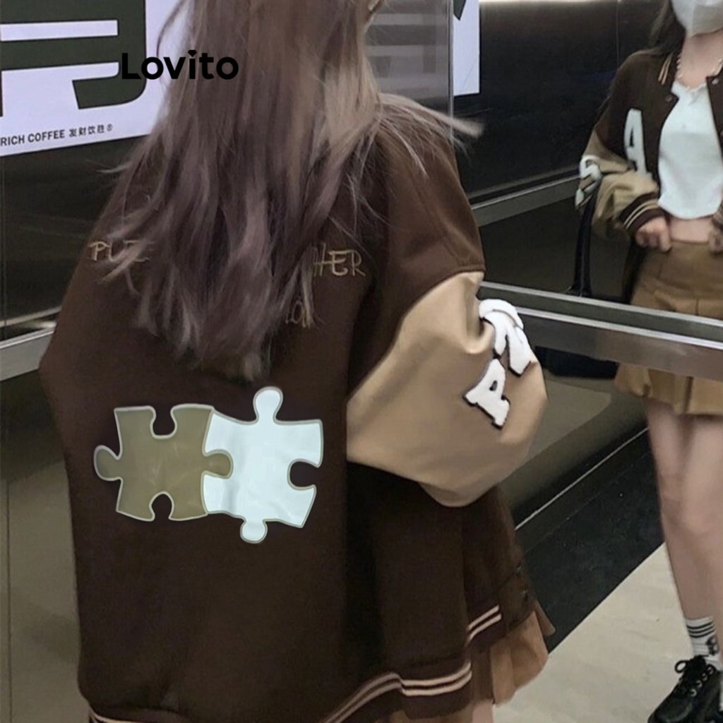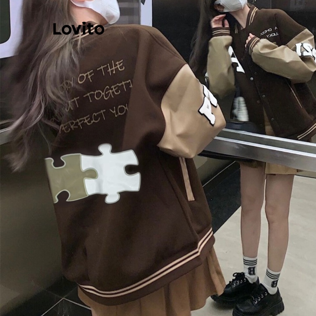 Lovito Áo khoác nữ dài tay có túi màu trơn thường ngày lnx07219 (Màu Nâu/Đen)