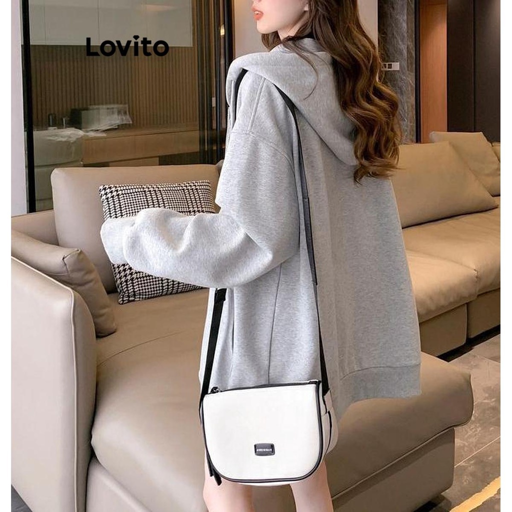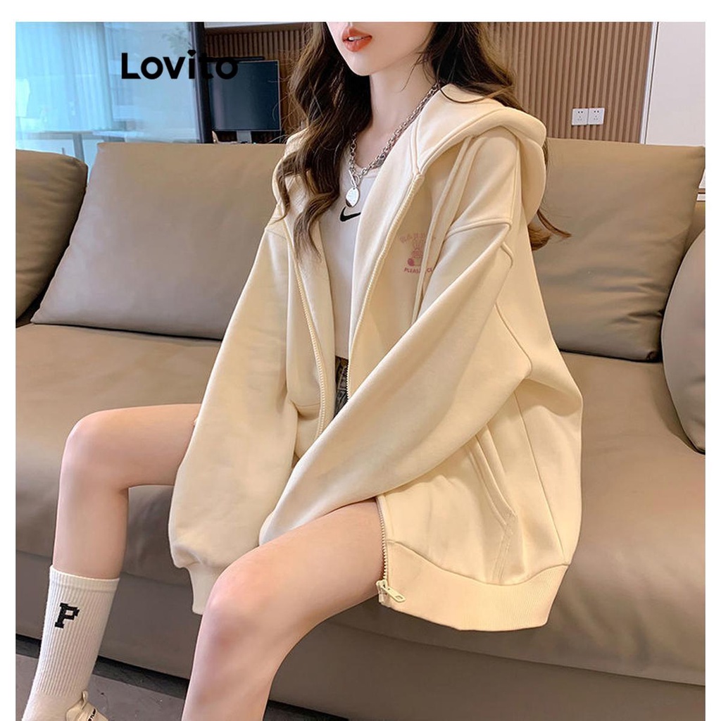 Lovito Áo len nữ in chữ có túi khóa kéo phong cách thường ngày lna26216 (Xanh dương đậm)