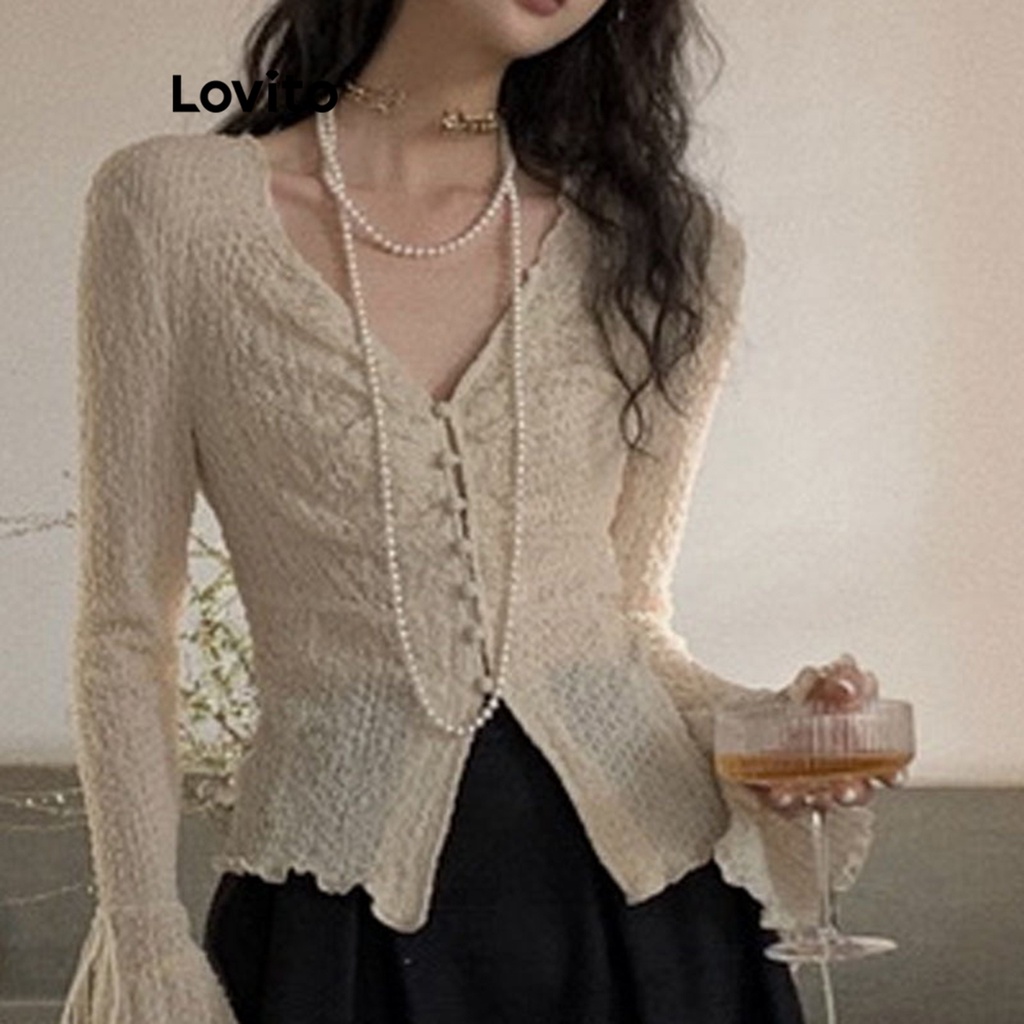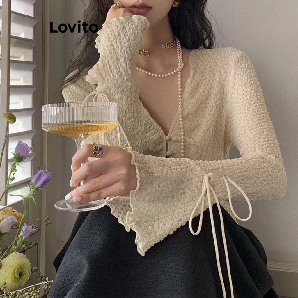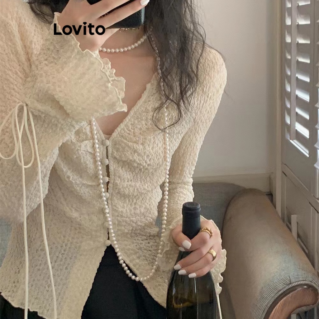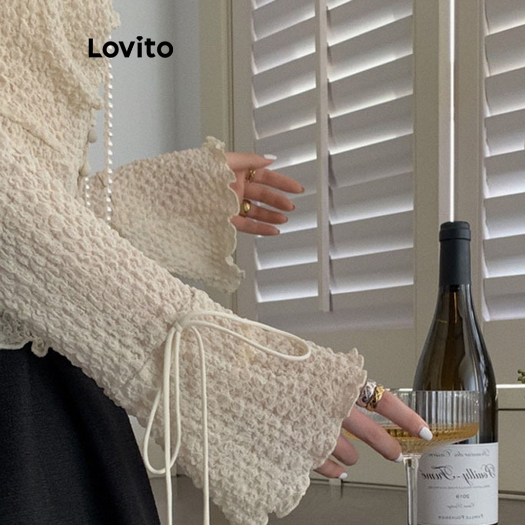 Lovito Áo cánh nữ dài tay cổ vuông ren phía trước màu trơn thường ngày lna11051 (Màu Trắng)