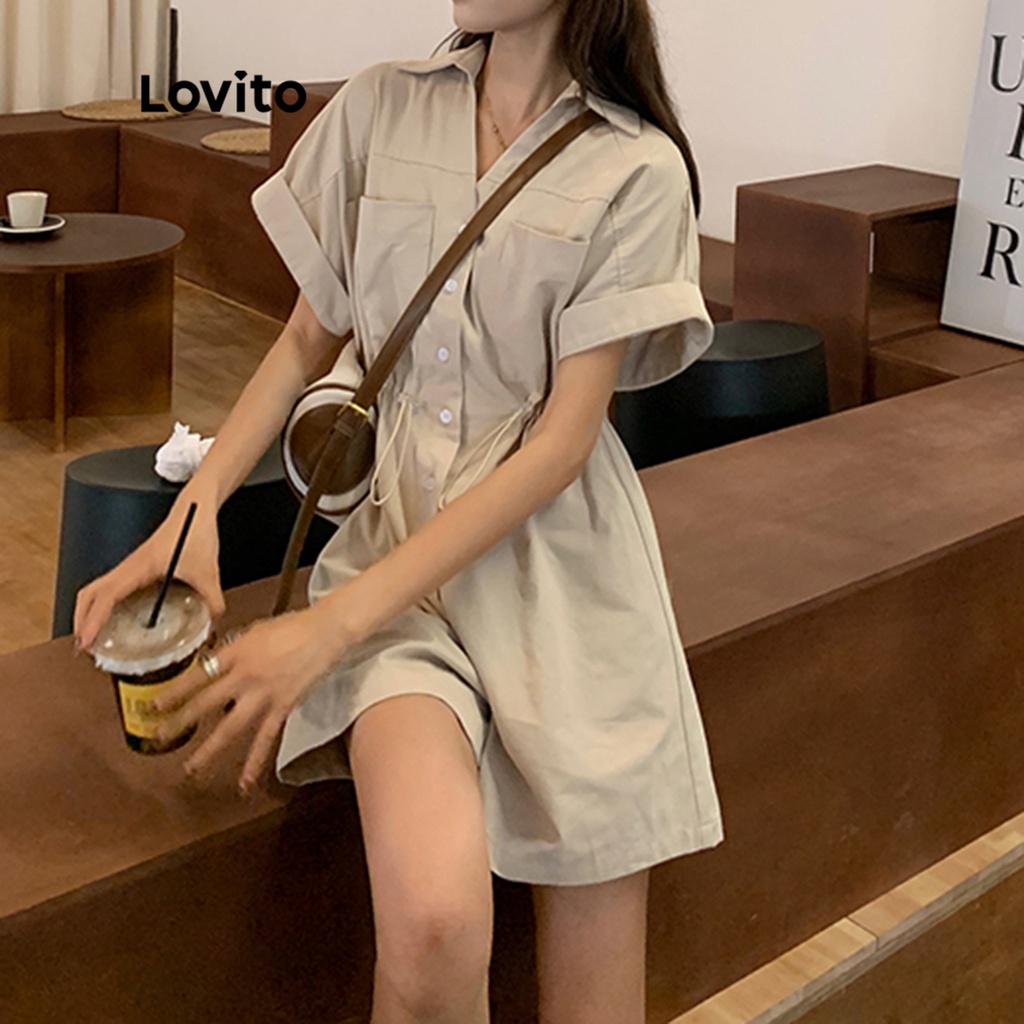 Lovito áo liền quần diềm Xếp Nếp có dây buộc thường ngày cho Nữ Màu Trơn lbe03105 (màu xanh lá cây)