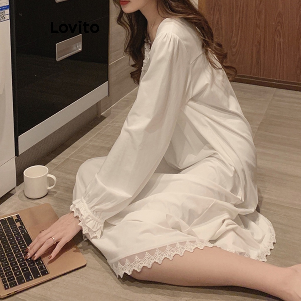 Lovito đồ ngủ nữ viền bèo nhún Ren Màu Trơn thường ngày Áo ngủ lne54489