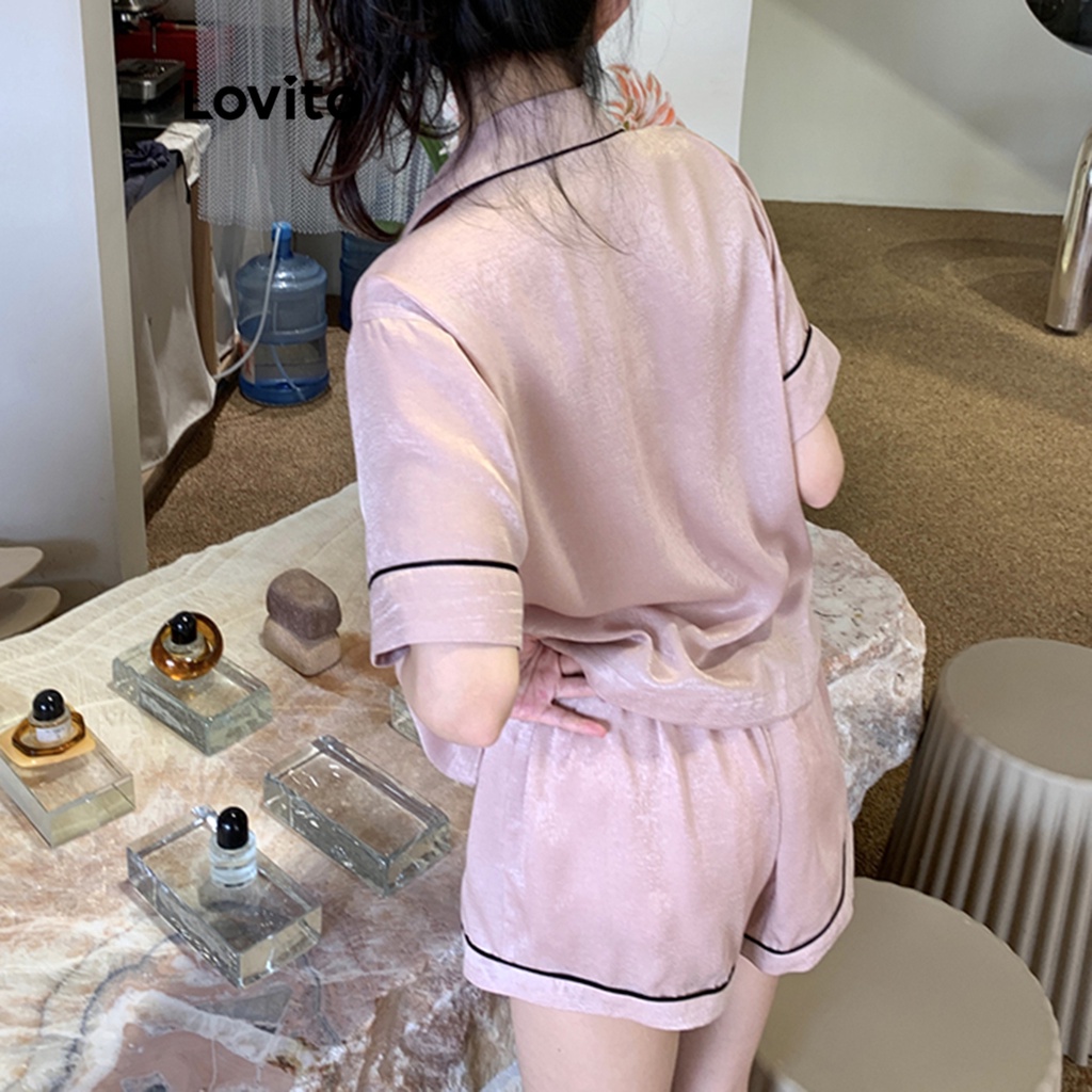 Lovito Bộ đồ ngủ nữ tay ngắn cổ có túi viền màu thường ngày lna12020 (Màu Đen)