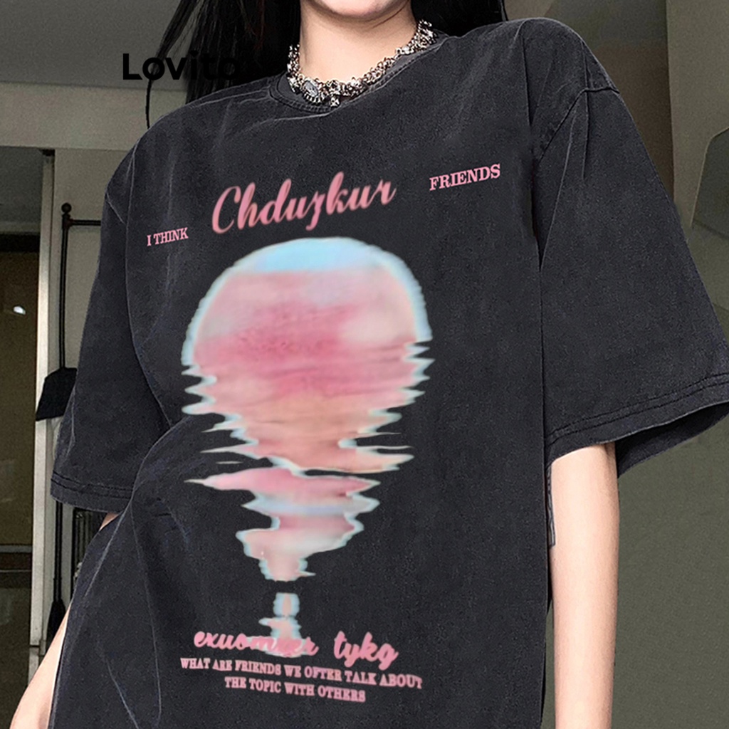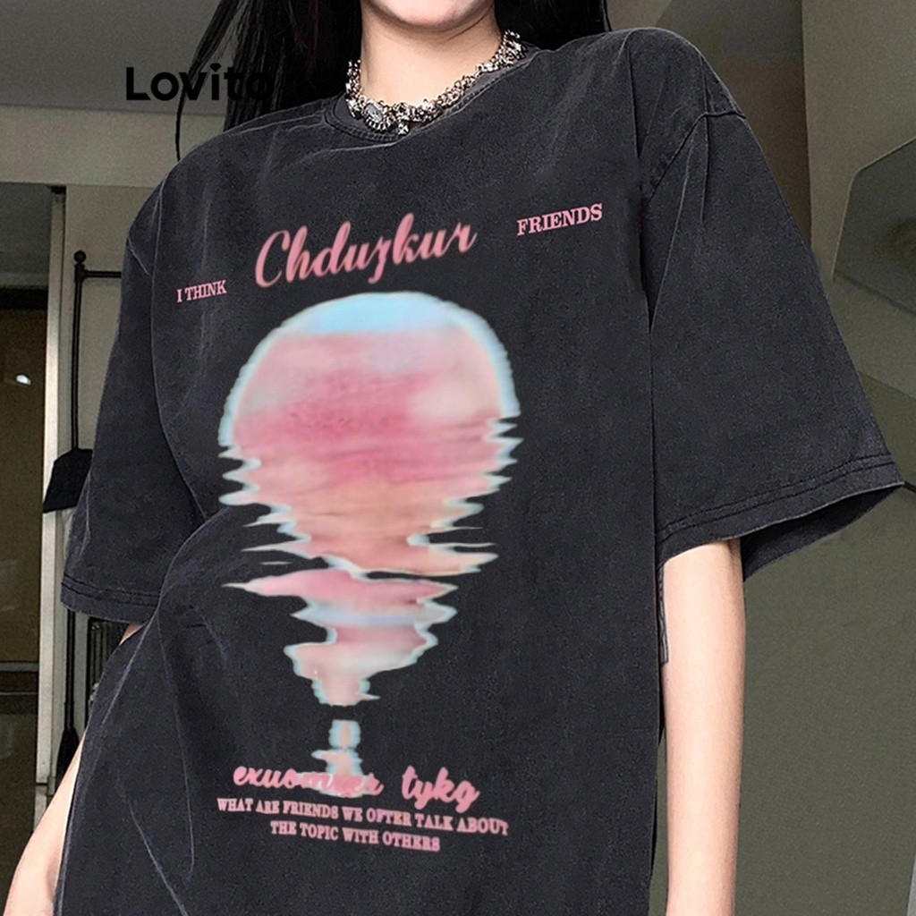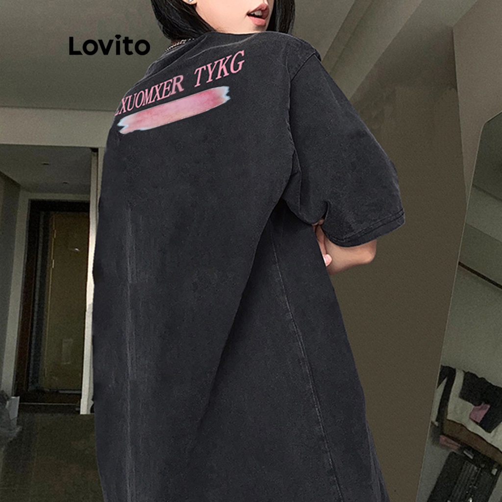 Áo phông nữ thường ngày in chữ ngoại cỡ lovito lne17058 (màu xám đậm)