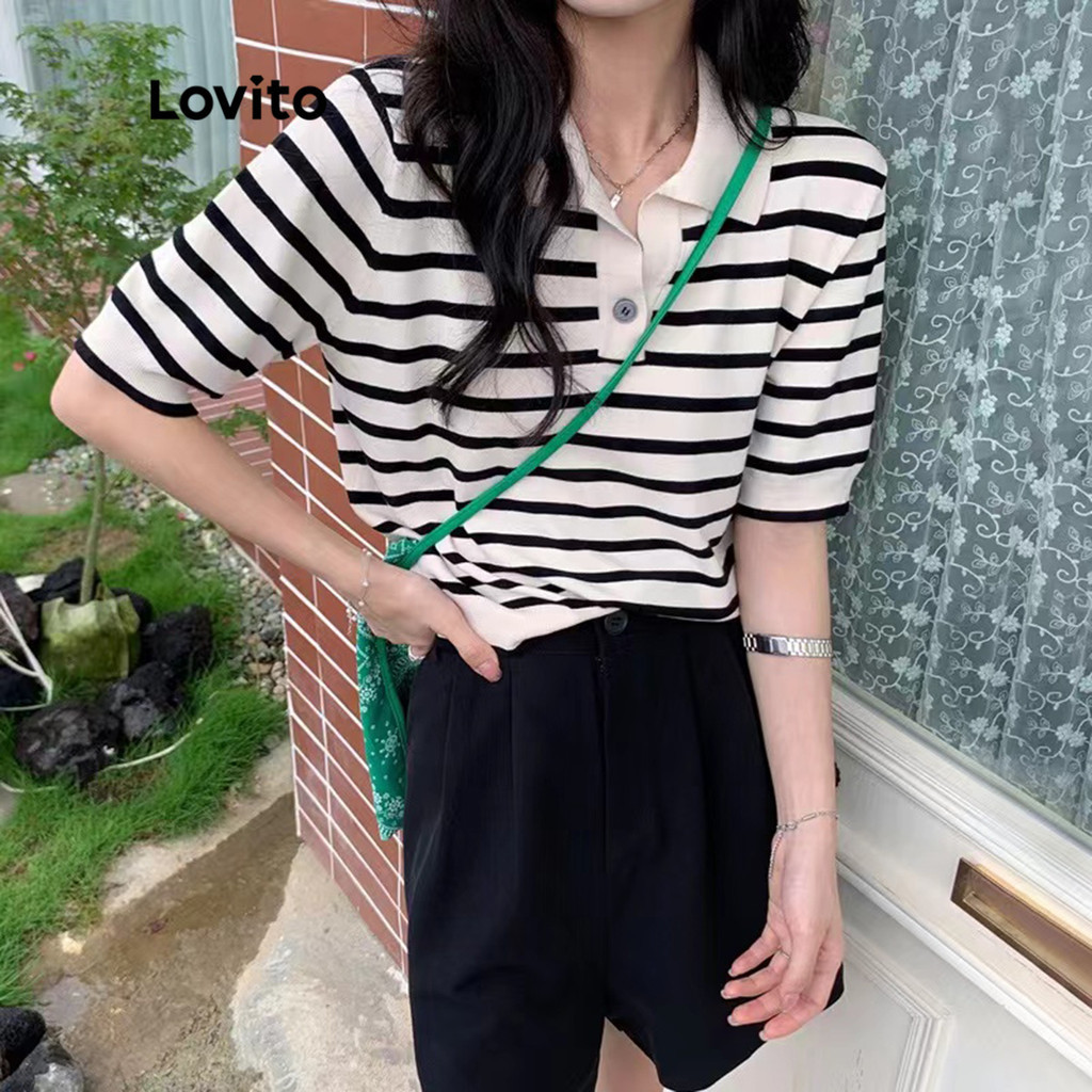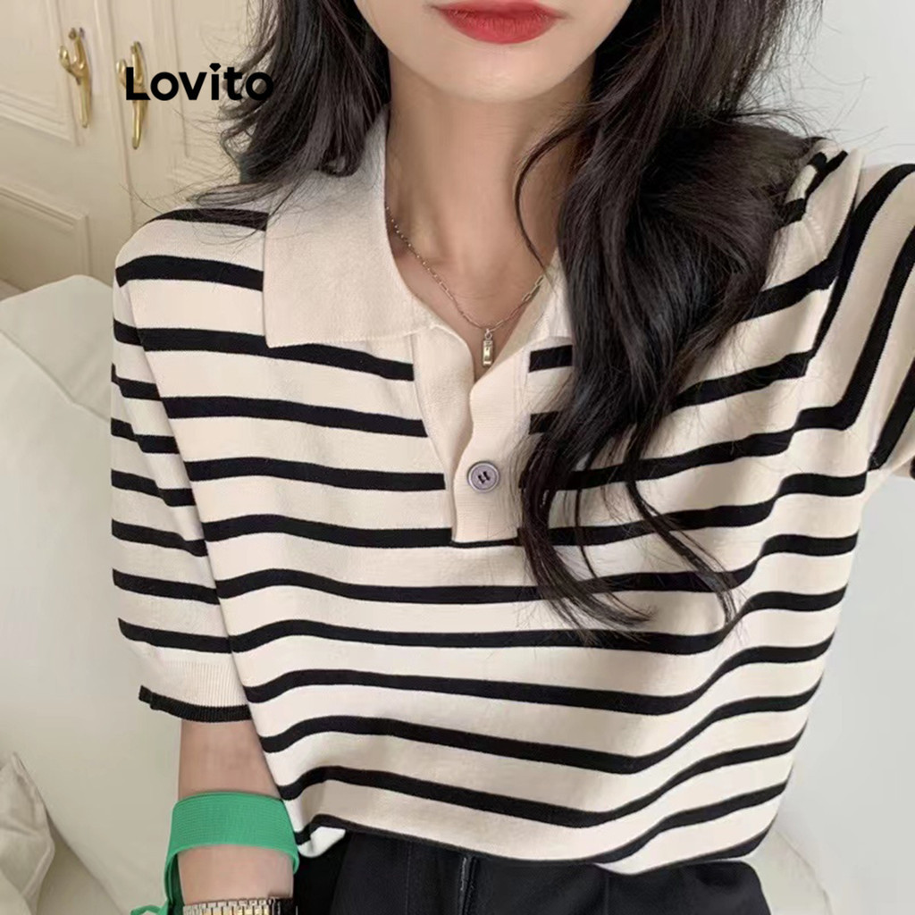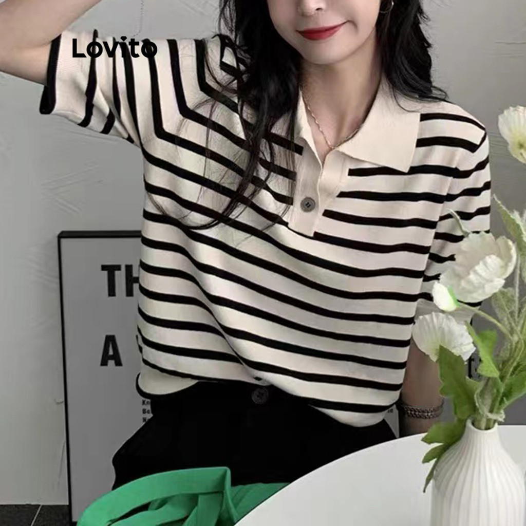 Lovito áo cánh sọc Polo ve áo phong cách thường ngày cho Nữ l33ad062 (màu xanh dương)