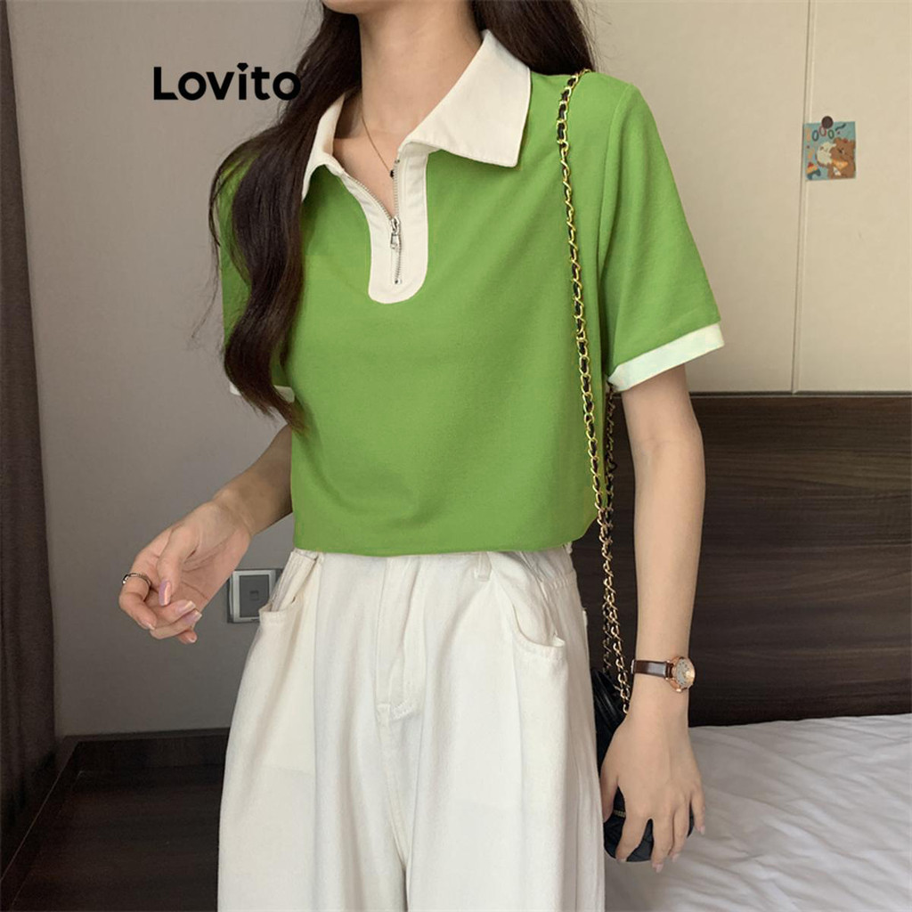 Lovito Áo Thun Nữ Khóa Kéo thêu khối màu trơn thường ngày lne13026 (Nhiều màu)