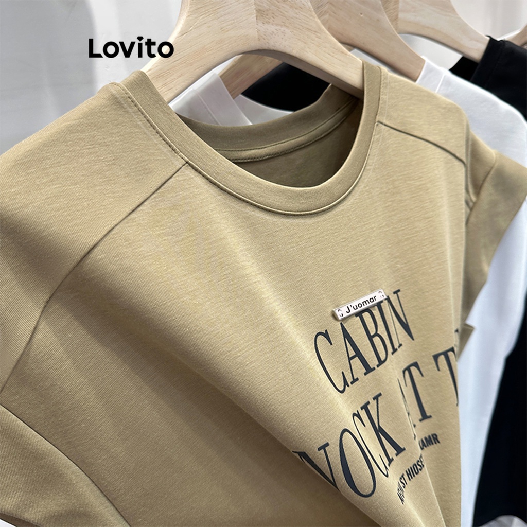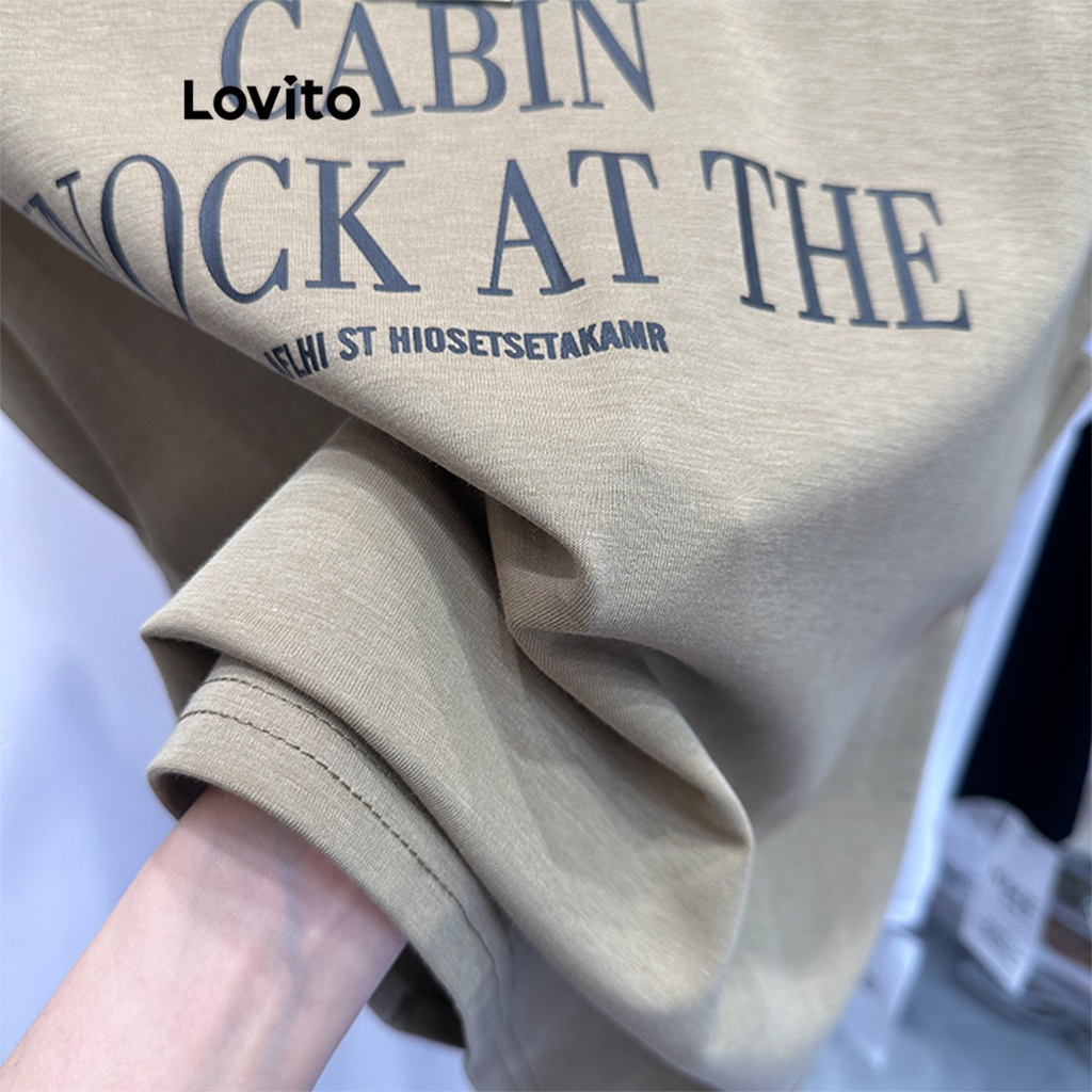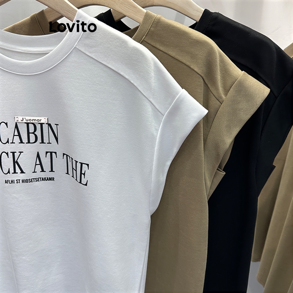 Lovito Áo phông thường ngày Cổ Tròn Tay Ngắn Chữ thả vai cho nữ lna09221 (Màu Đen)