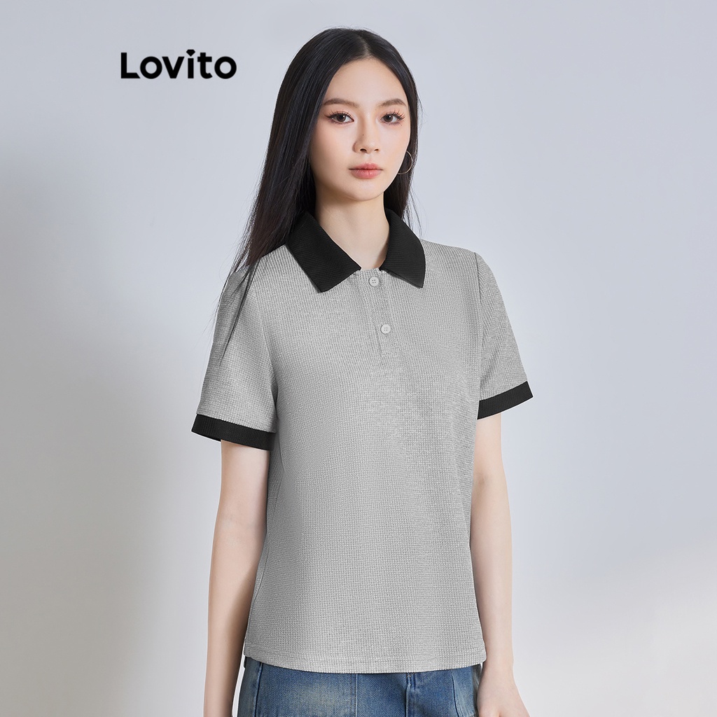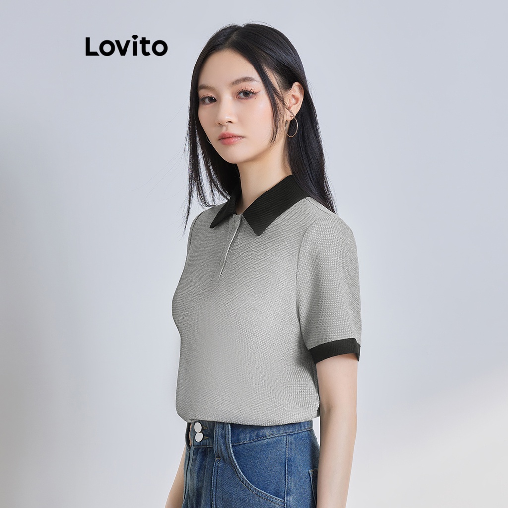 Lovito Áo polo kẻ sọc màu khối thường ngày cho Nữ Áo dệt kim ngắn tay lex01010 (Nhiều màu)