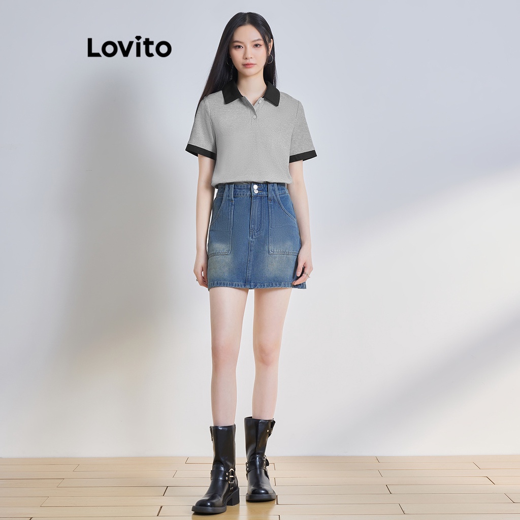 Lovito Áo Thun Nữ Tay Ngắn có cúc khối màu trơn thường ngày l47ed014 (Màu Đen)