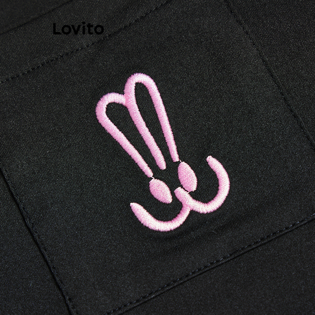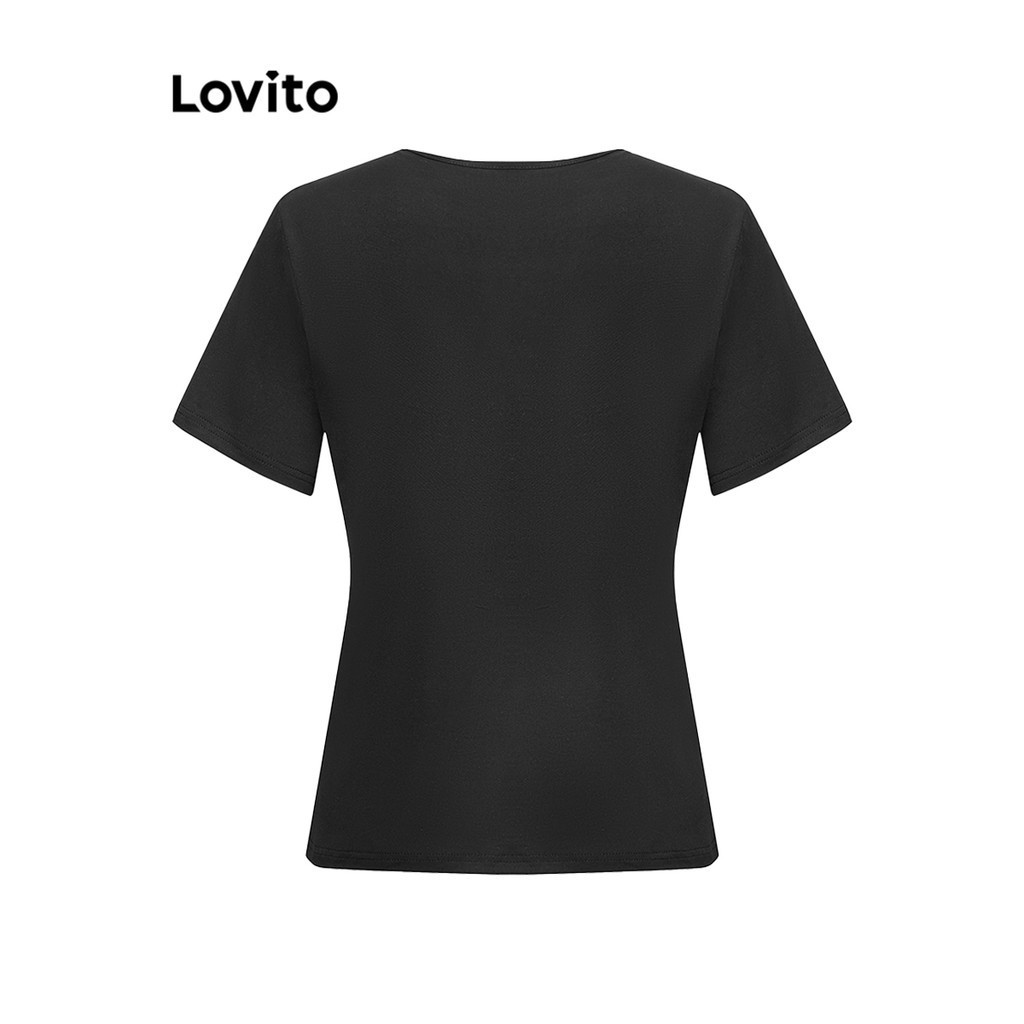Lovito Áo phông thường ngày Cổ Tròn Tay Ngắn Chữ thả vai cho nữ lna09221 (Màu Đen)