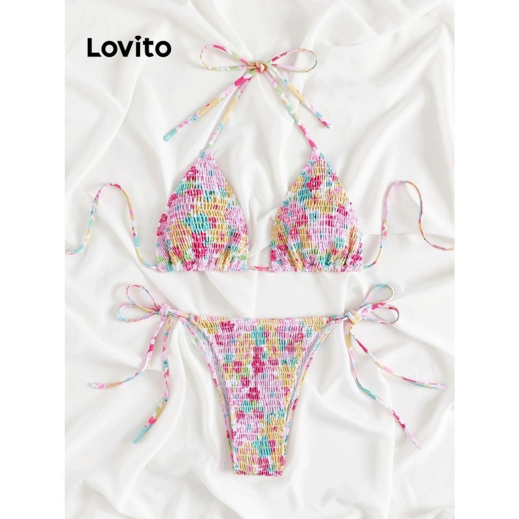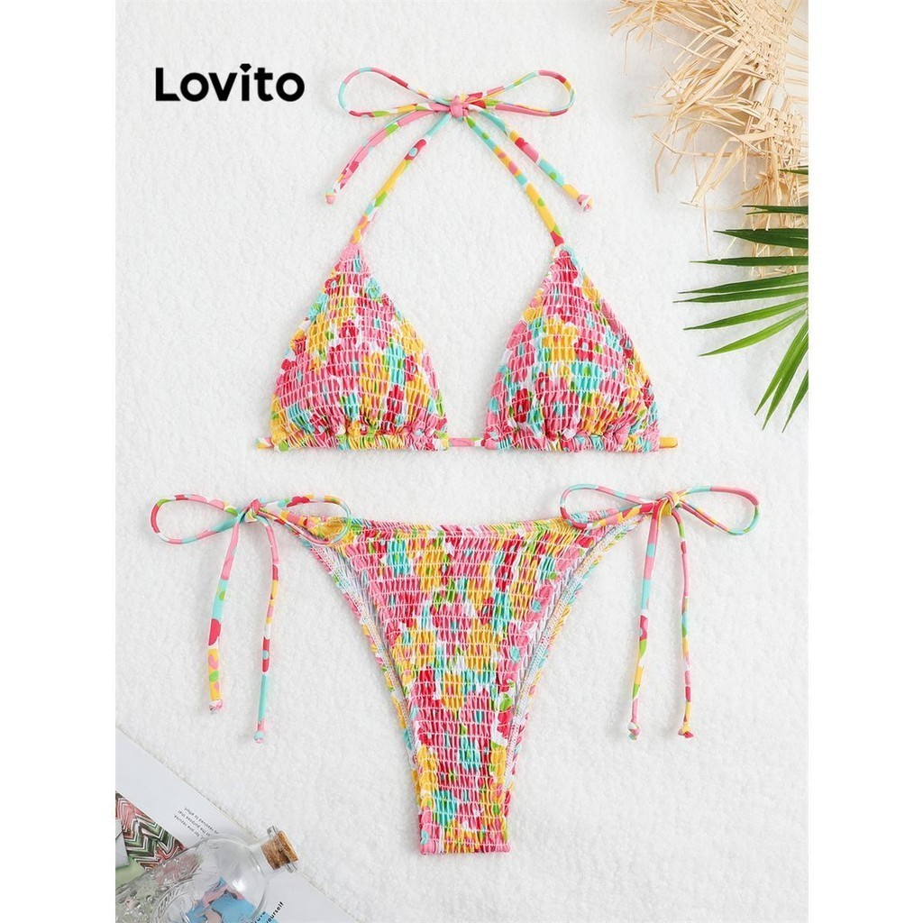 Lovito Bộ Bikini Vải Jacquard cổ yếm trơn thường ngày 3 trong 1 lne27049 (Màu Hồng/Xanh lá cây)