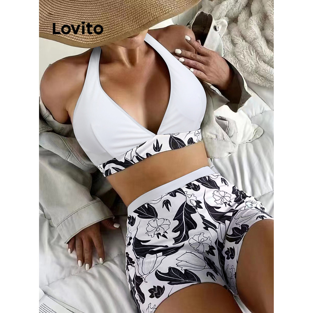 Lovito Bộ Bikini Vải Jacquard cổ yếm trơn thường ngày 3 trong 1 lne27049 (Màu Hồng/Xanh lá cây)