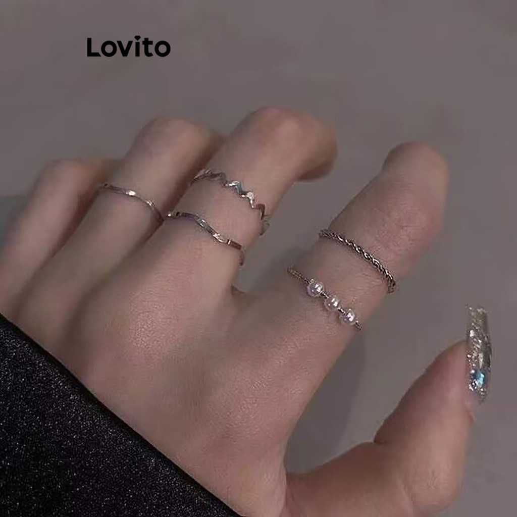 Lovito Nhẫn Cặp Đôi Ngọc Trai Kim cương giả ngôi sao bạc cho nữ lfa27060