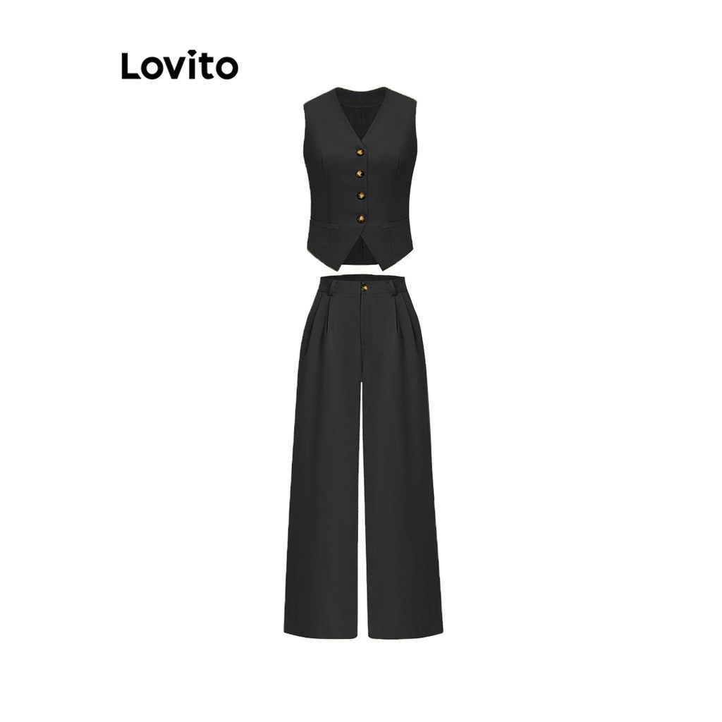 Lovito Bộ Quần Suông suông rộng có túi màu trơn thường ngày cho Nữ l55ad075 (áo ba lỗ/quần dài)