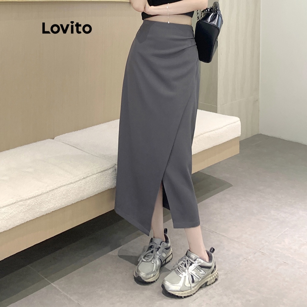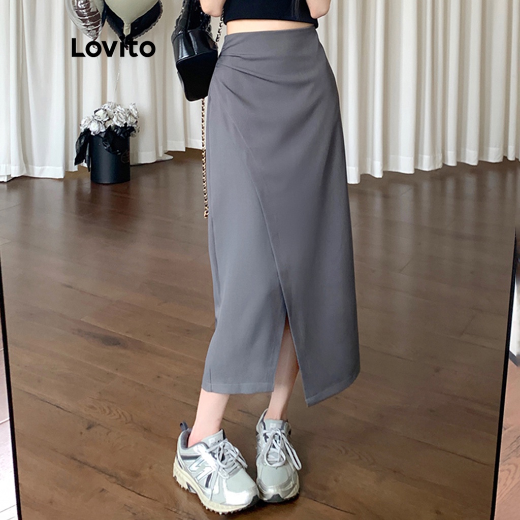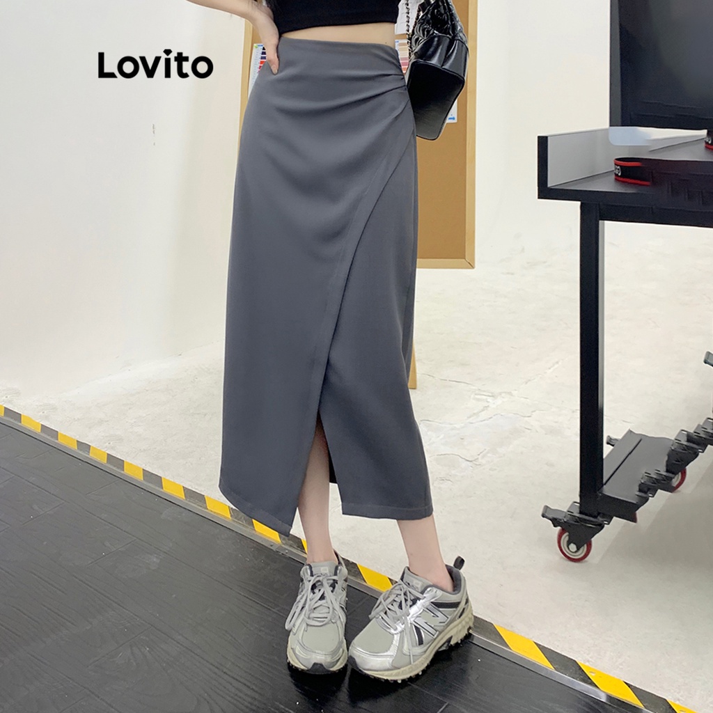 Lovito lne09154 Chân Váy Maxi Nữ Xẻ Tà dây rút màu trơn thường ngày (Kaki nhẹ)