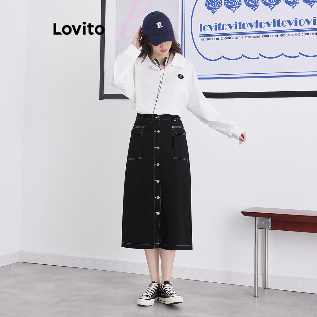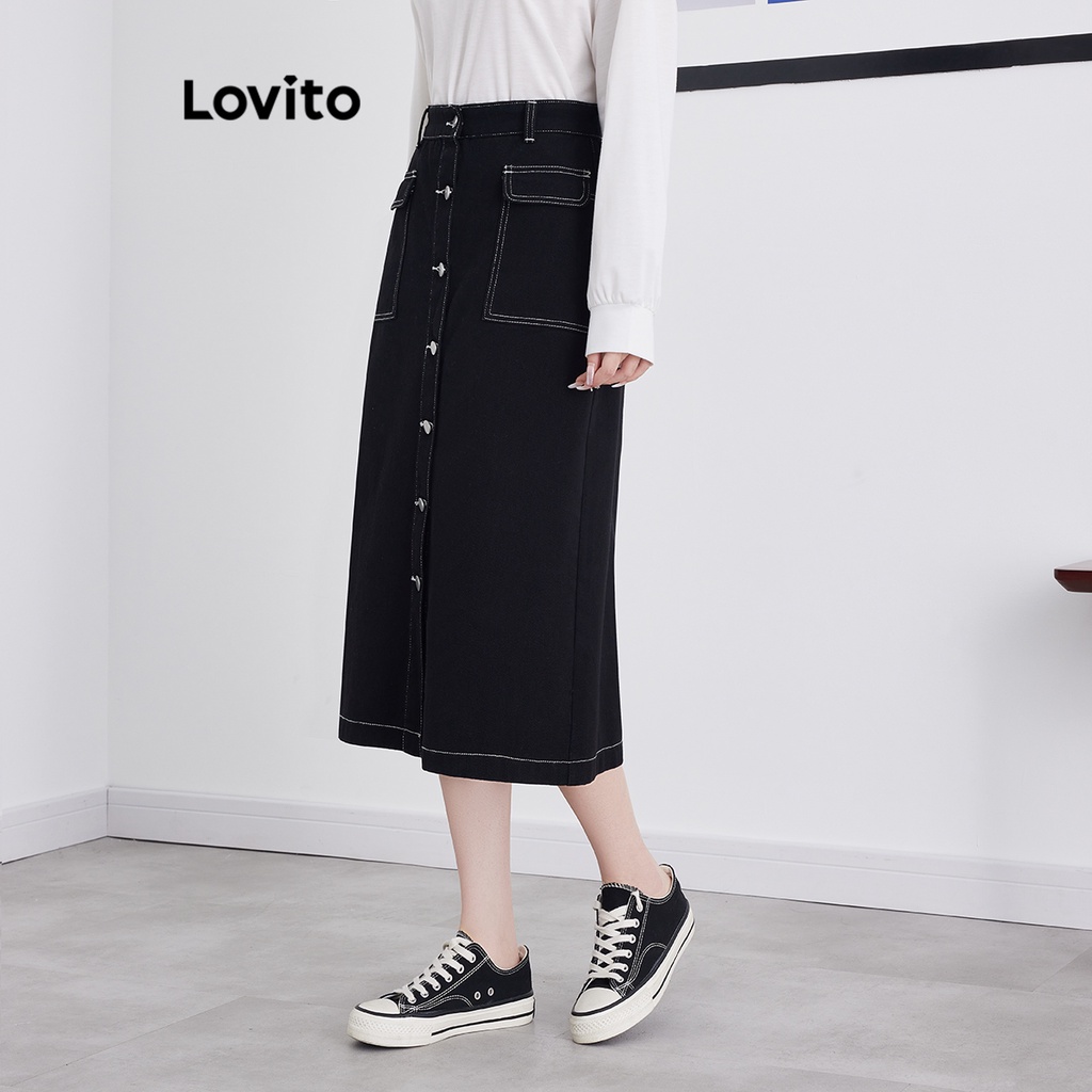 Lovito Chân váy midi cài khuy trước màu trơn thường ngày thời trang nữ l39ad078 (màu xanh dương)