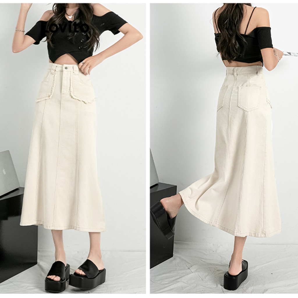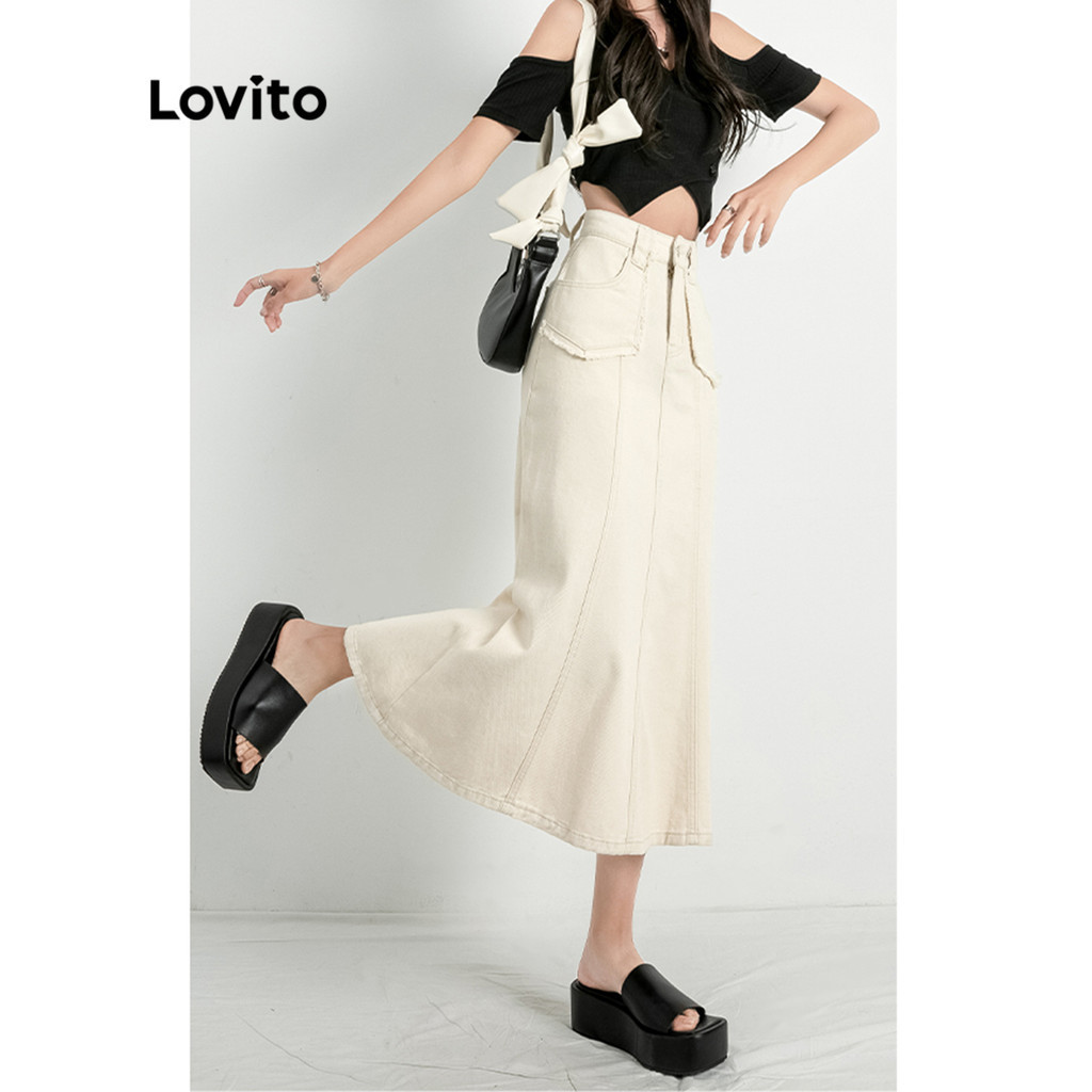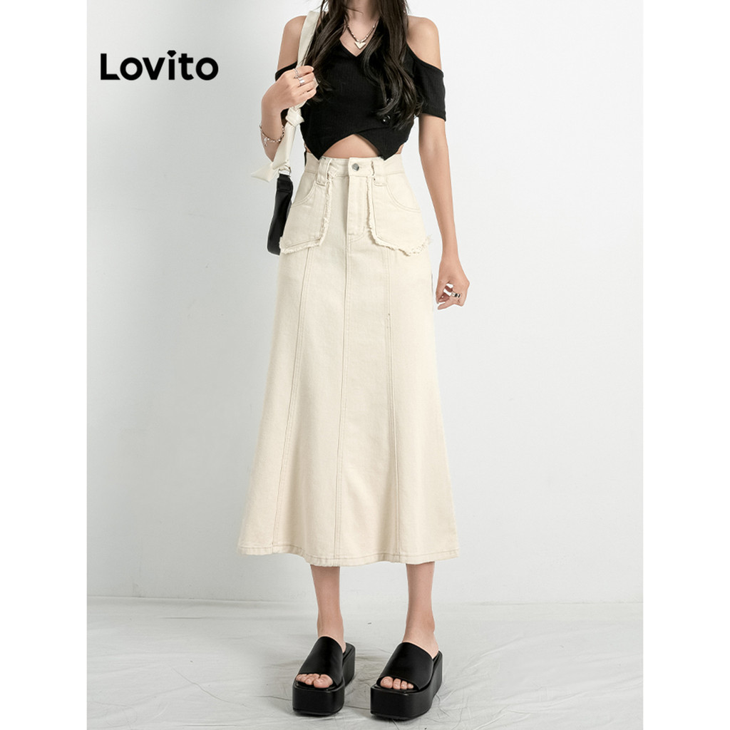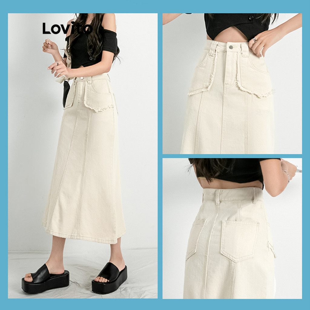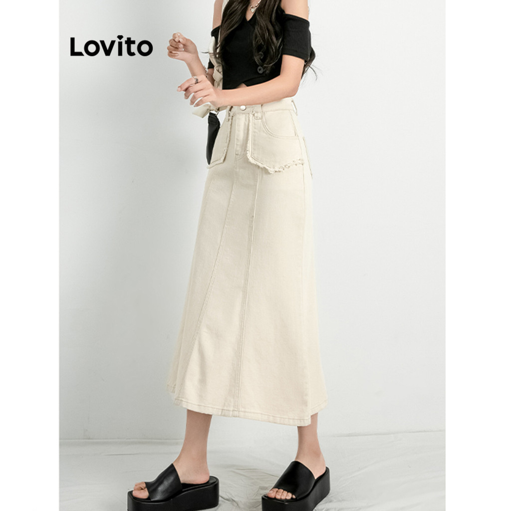 Lovito Chân Váy Denim xẻ tà đơn giản thanh lịch cho nữ l59ed009 (Màu Trắng nhạt)