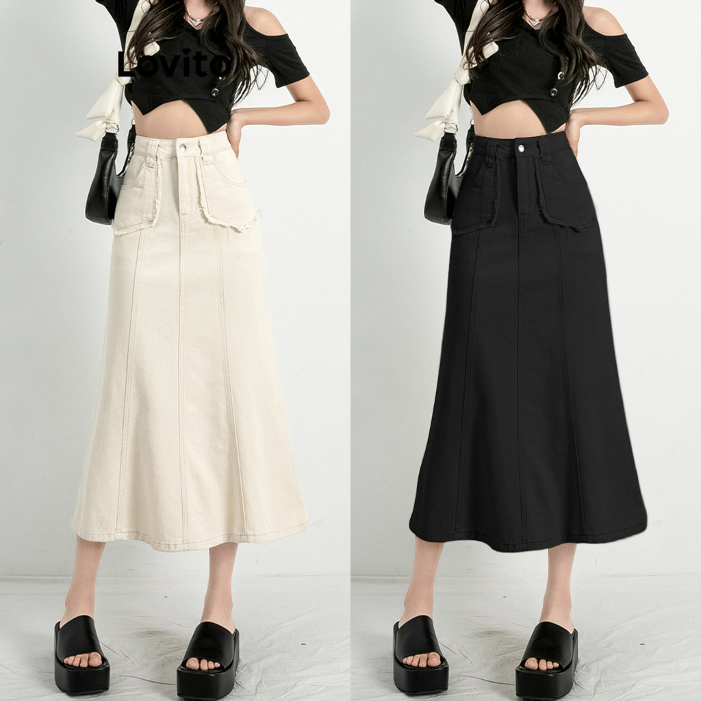 Lovito Chân váy denim có túi màu trơn thường ngày cho Nữ l58ad125 (Màu Đen)
